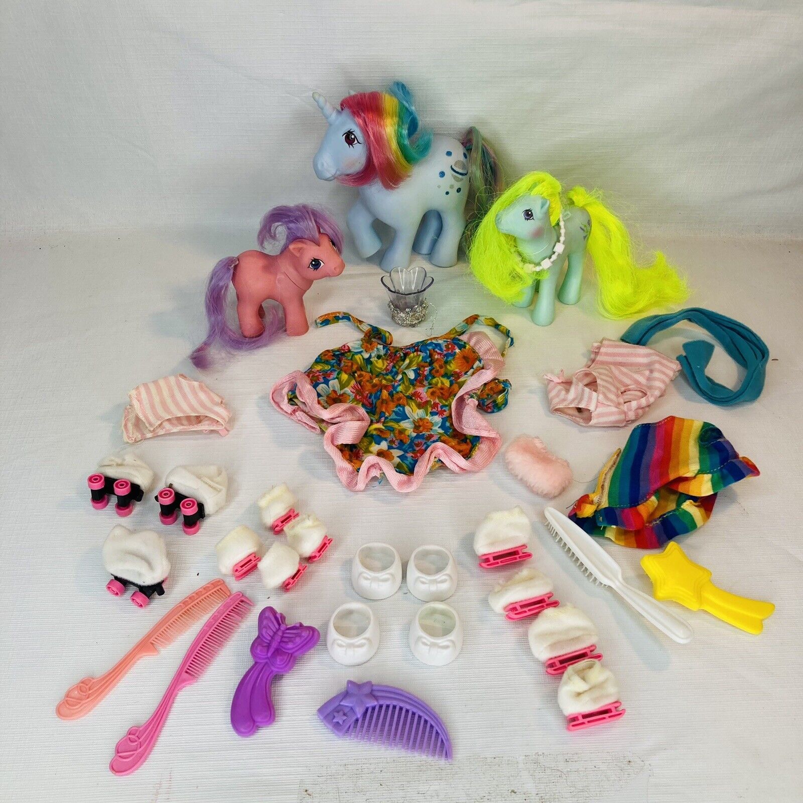 This is a great collectible vintage My Little Pony 32 lot! Includes 3 ponies, mixed accessories and clothing, for a total of 32 pieces.
