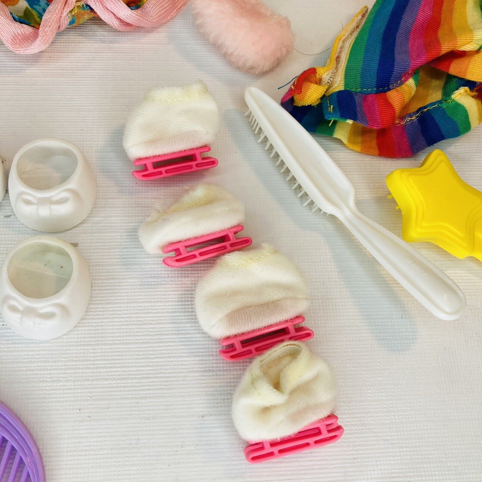 Clothing: 1 floral cape, 1 rainbow outfit, 2 pink and white striped outfit, 1 teal scarf, 1 crown, 4 ice skates, 4 white shoes, 4 smaller ice skates, 3 (missing one) ice skates, 1 pink muff, 1 white necklace, 1 purple Rainbow Cloud star comb, 1 purple GI Original Lickety Split Butterfly Brush Comb, 1 coral comb, 1 pink comb.