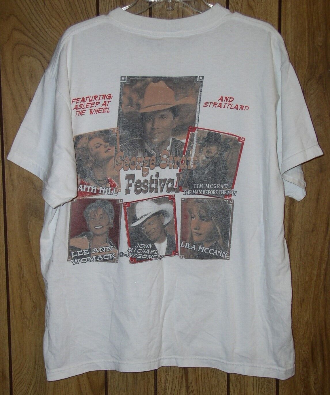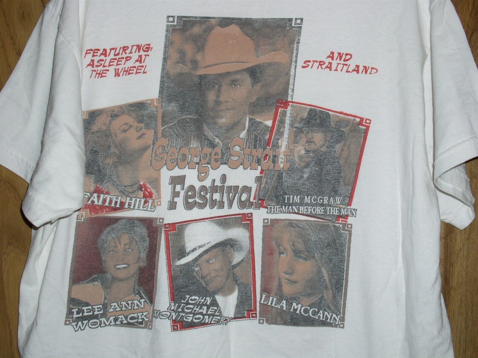 This is a rare, vintage, alternate design concert t shirt entitled, "The George Strait Festival Featuring Asleep At The Wheel and Straitland". Acts are: Faith Hill, Tim McGraw, Lee Ann Womack, John Michael Montgomery, and Lila McCann. Tag reads: Basic Editions. A terrific item for the fan or collector.