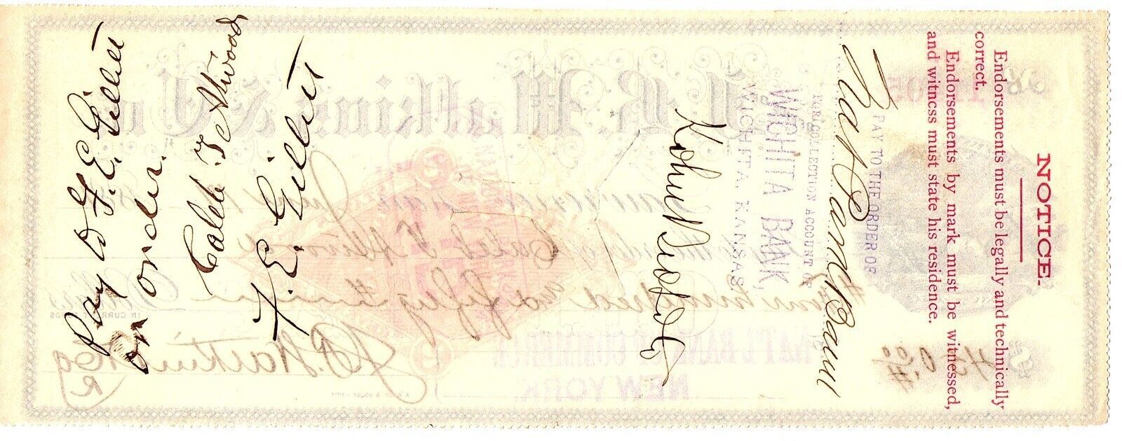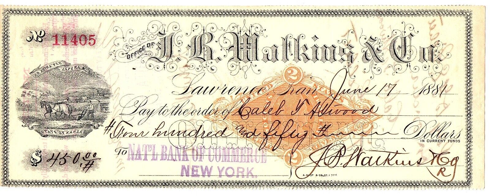 1881 $450 Check Signed by J. R. Watkins, Lawrence, State of Kansas, Caleb Atwood