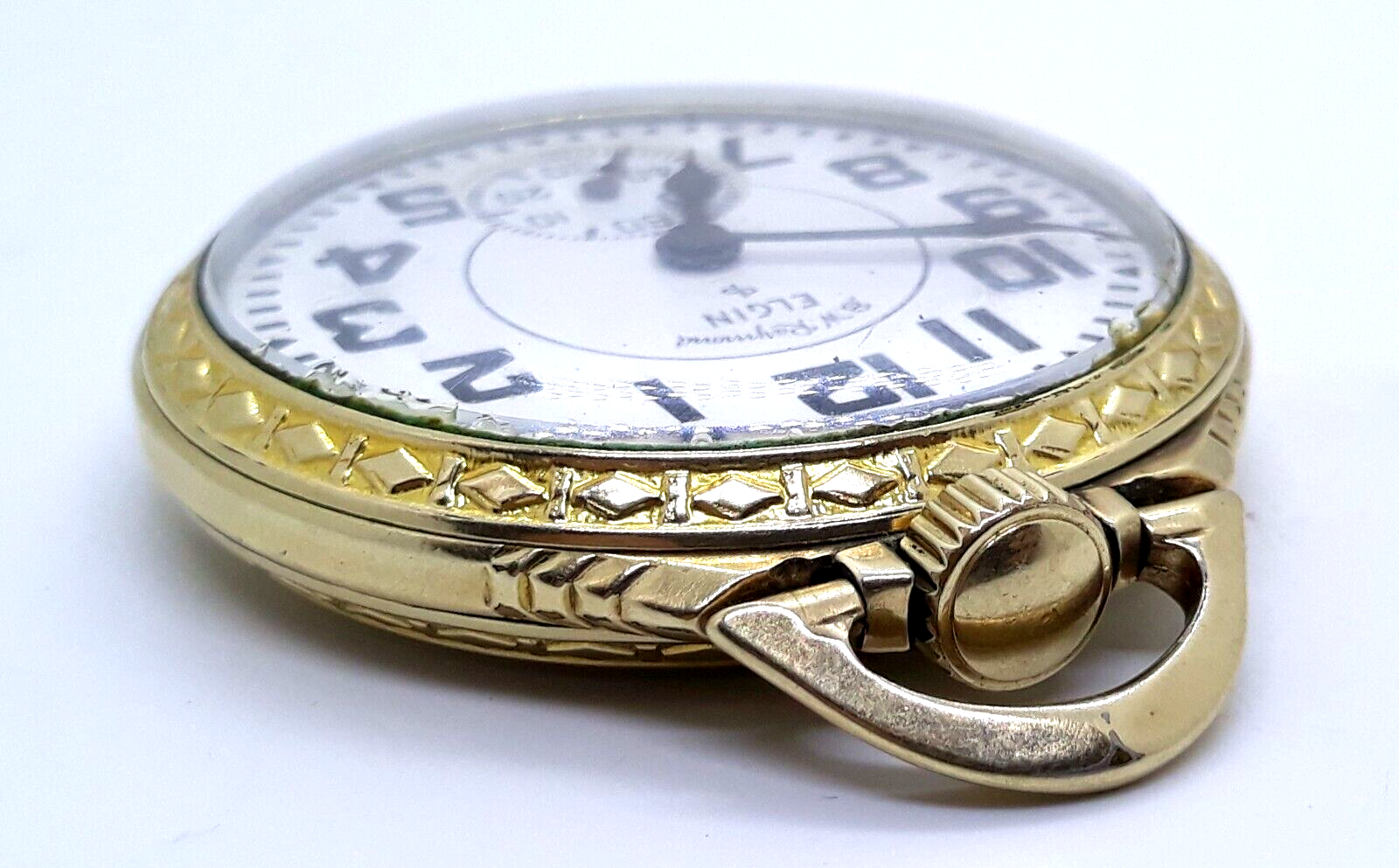 Used pocket watch which needs repair. Laying flat on a table once started the watch will run. But if it raised in a standing position it stops. I am not a watch expert so have not and will not fiddle with it. Crystal is plastic or acrylic. Minor scuffs and scratches to the case from normal wear. The watch pictured is the exact watch buyer will receive. I am selling this piece "as is" with no warranty and no returns due to it's condition. By purchasing buyer is agreeing to these terms.