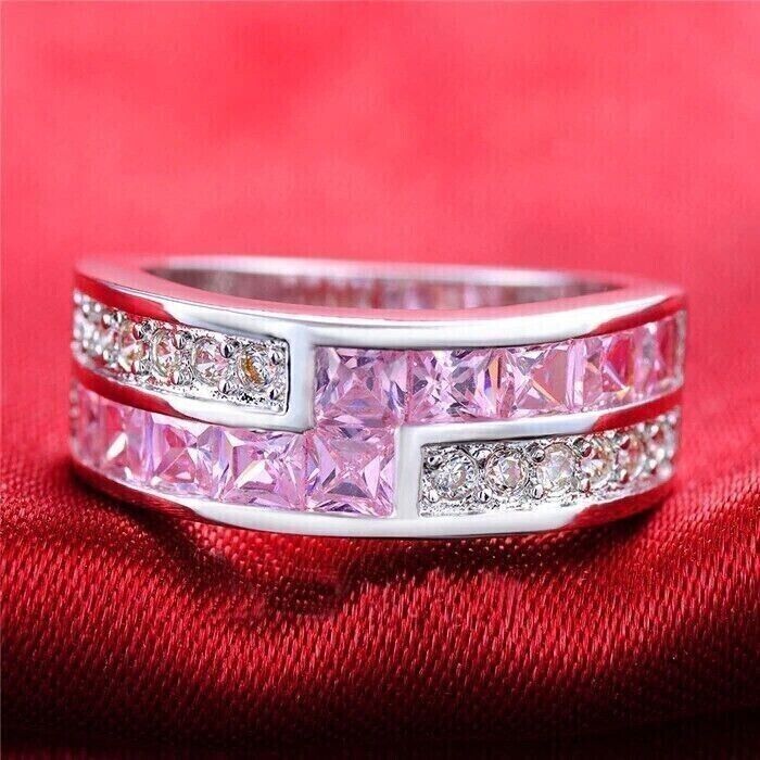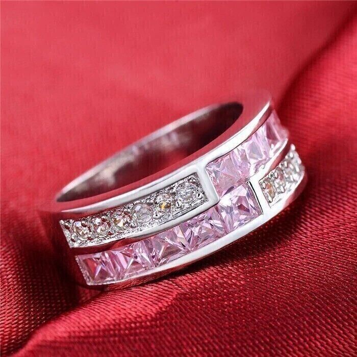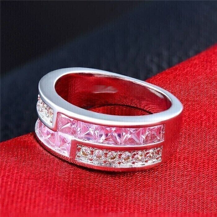14K White Gold Plated 1.75Ct Princess Cut Lab-Created Pink Sapphire Band Ring