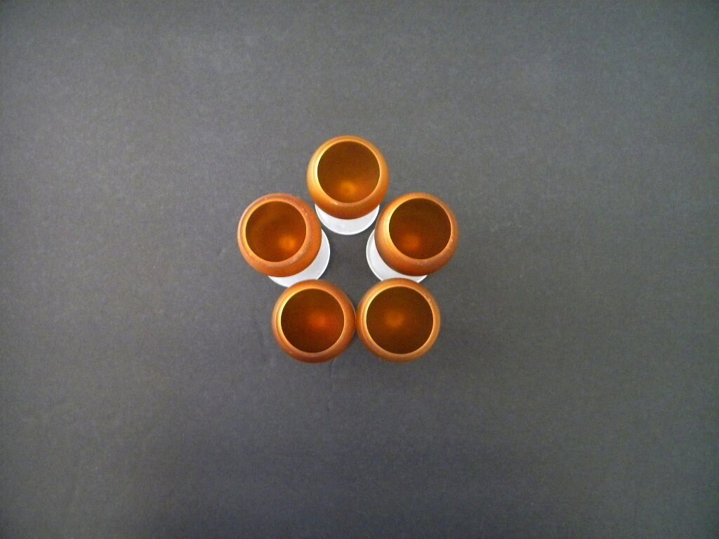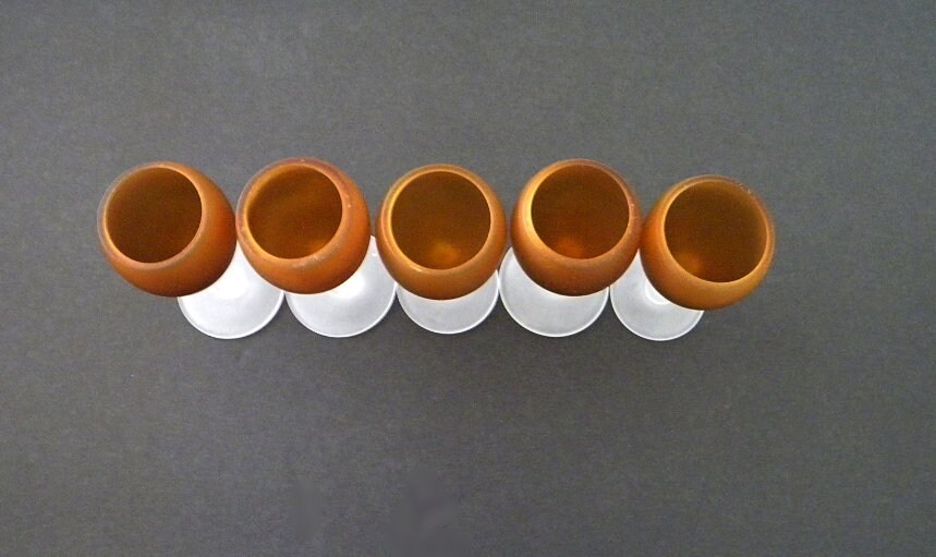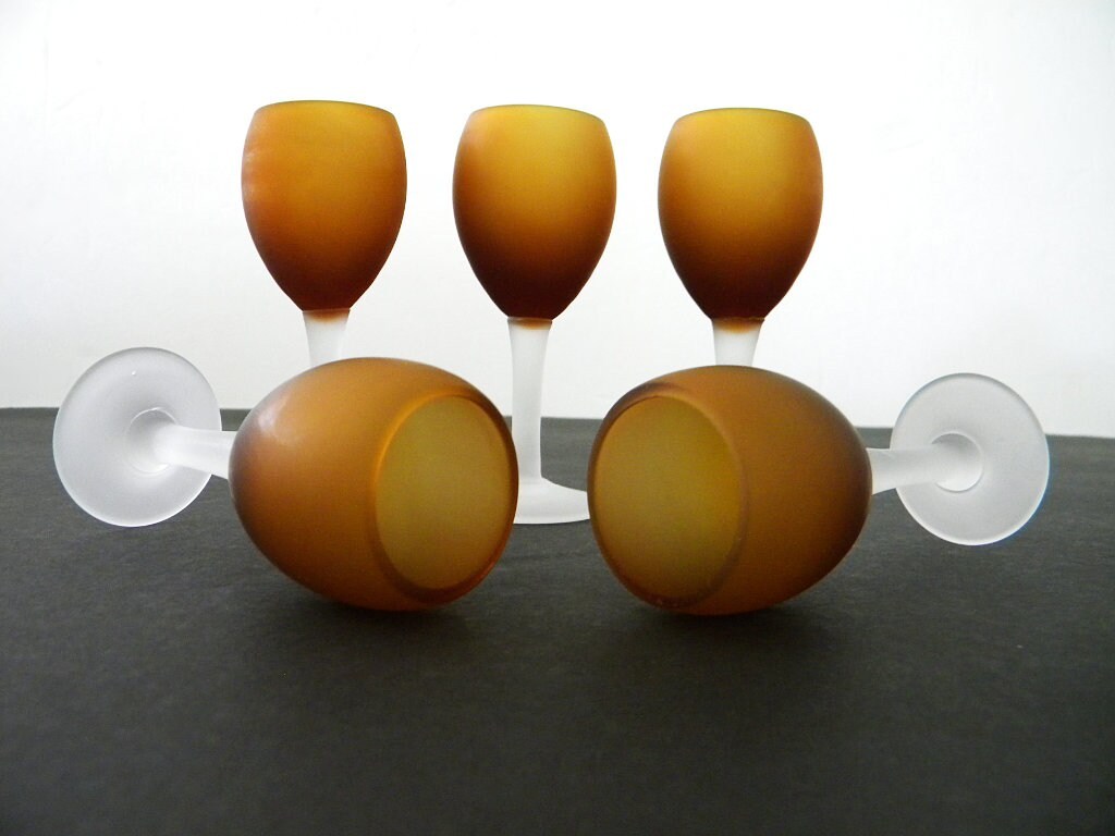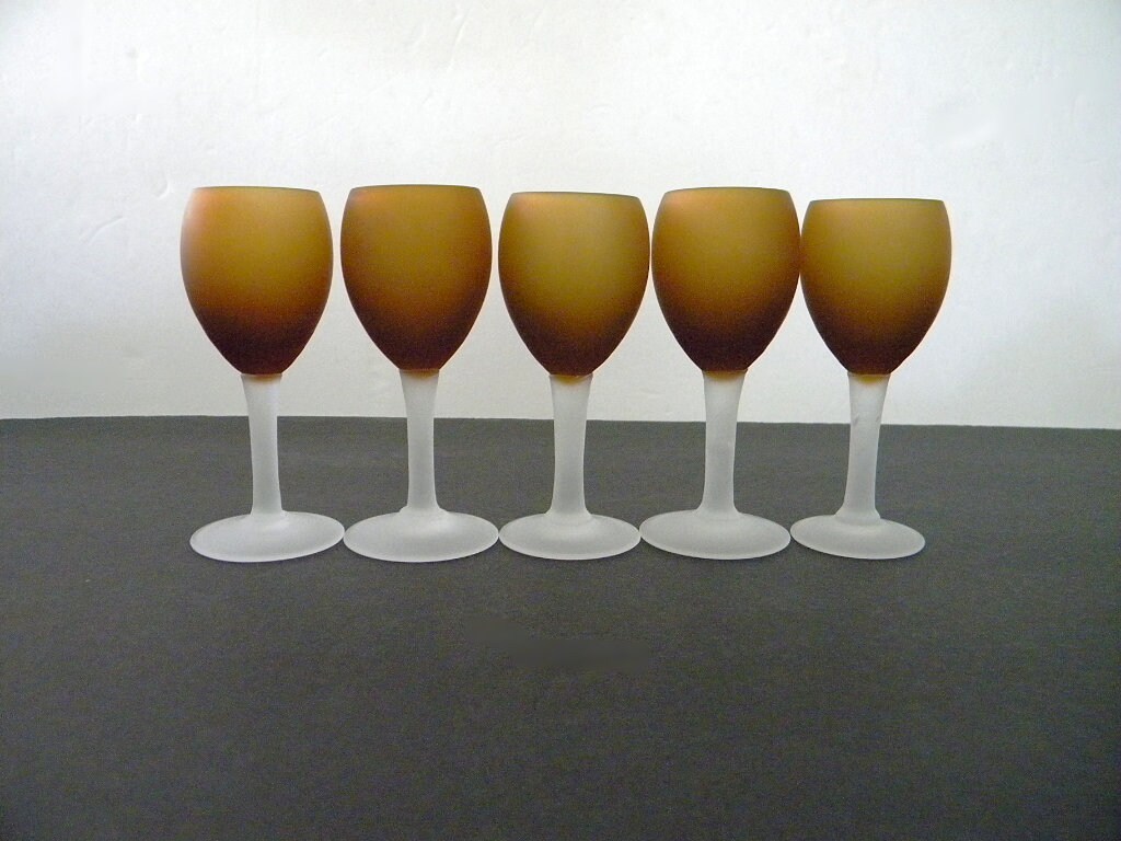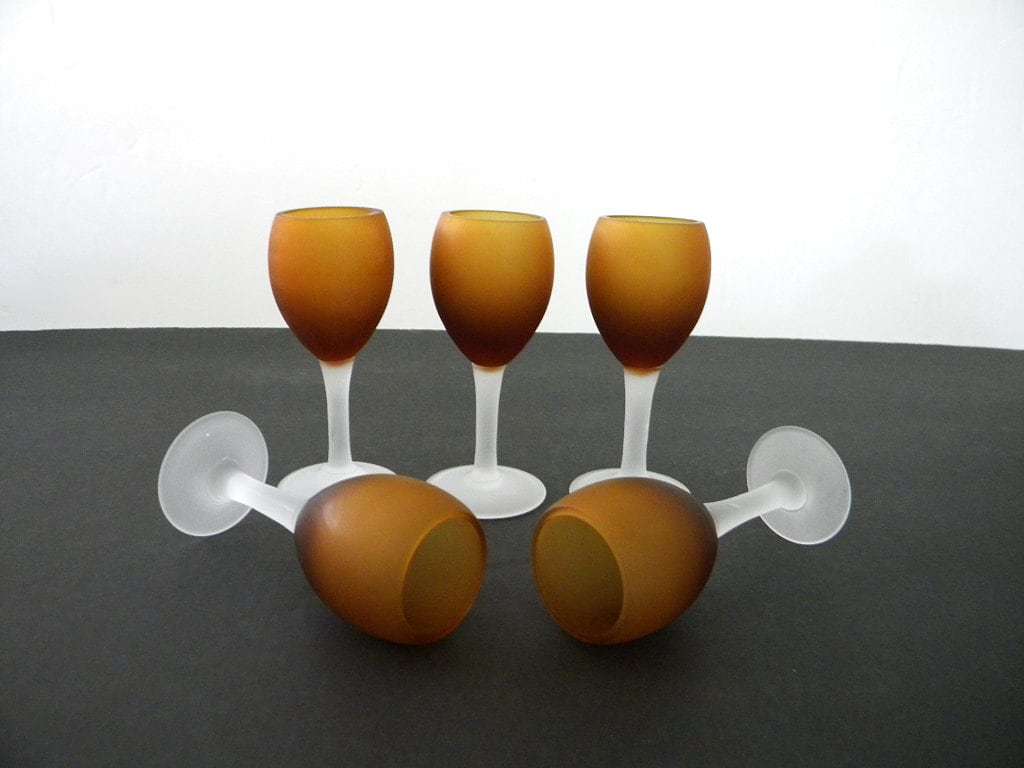 Elegant vintage frosted cordial glasses from 1970s. Warm wood color of mustard brown with white stem, set of 5. 1 oz each, 3 5/8" high, 1 3/8" top diameter, 1 3/8" base diameter. Very good condition, no chipping, no cracks, minor wear.