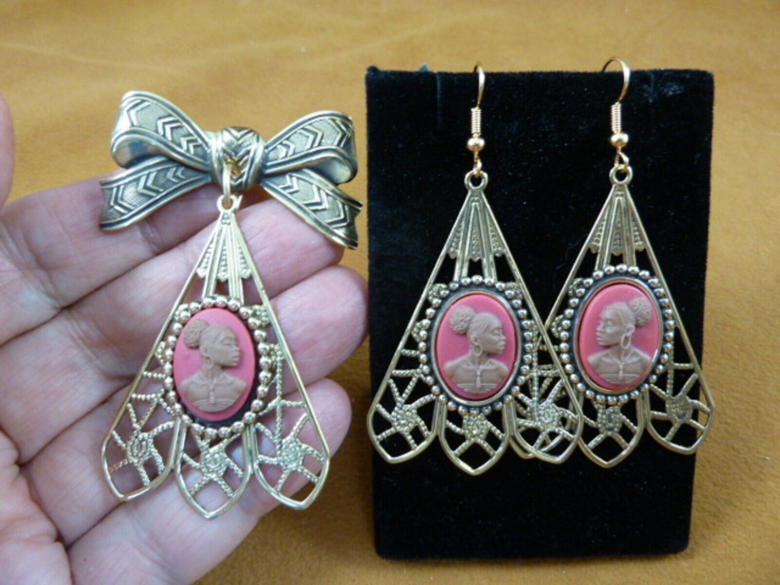 (Internal #CA30-301) Excellent side-view cameo of an AFRICAN-AMERICAN CAMEO PIN AND EARRING SET, cameo with Dark pink back, milk chocolate lady.