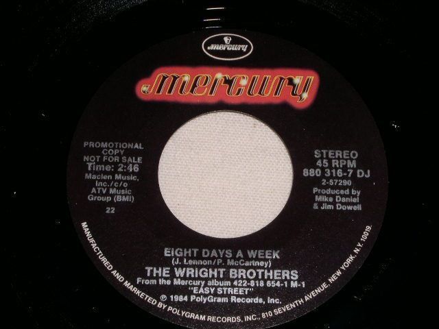 This is the original, vintage promotional 45 rpm release of The Wright Brothers', rendition of "Eight Days A Week". Same flipside. Record label Mercury 880 316-7.