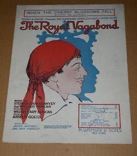 This is a vintage piece of sheet music entitled, "When The Cherry Blossoms Fall" from "The Royal Vagabond". Dated 1919 M. Witmark Sons.