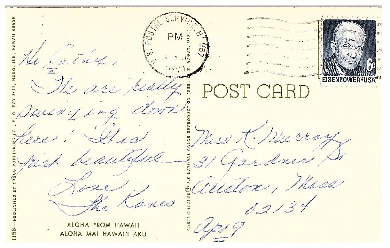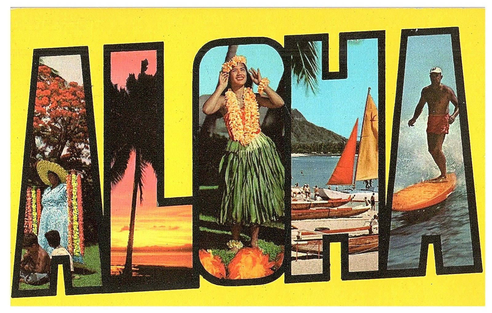 Aloha from Hawaii Large Letter Postcard Hula Surfing Waikiki 1971