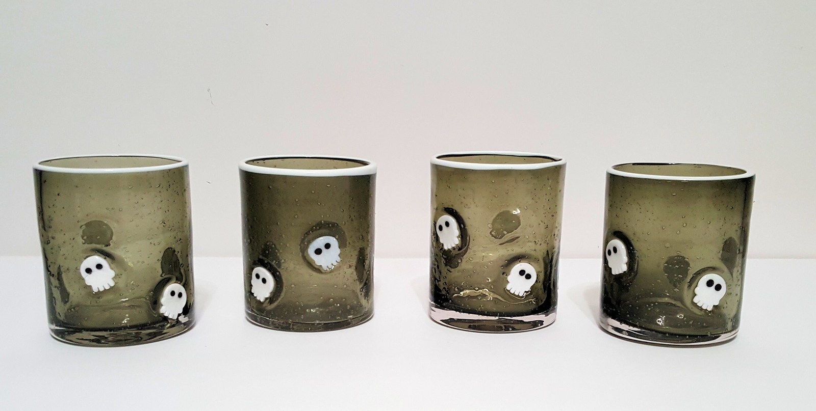 These whimsical glasses will have you under their spell. Artisans hand mold soda lime glass, pressing into it as it cools with a classic Halloween icon. This lends a satisfying grip and the illusion of floating skulls. A white gloss on its rim elevates the look.