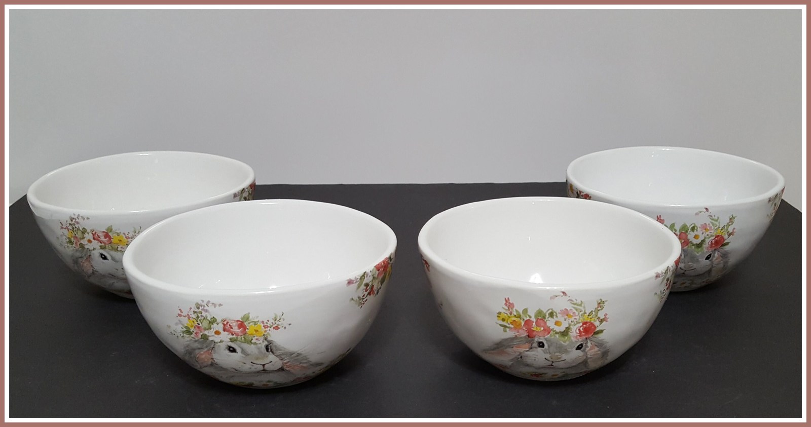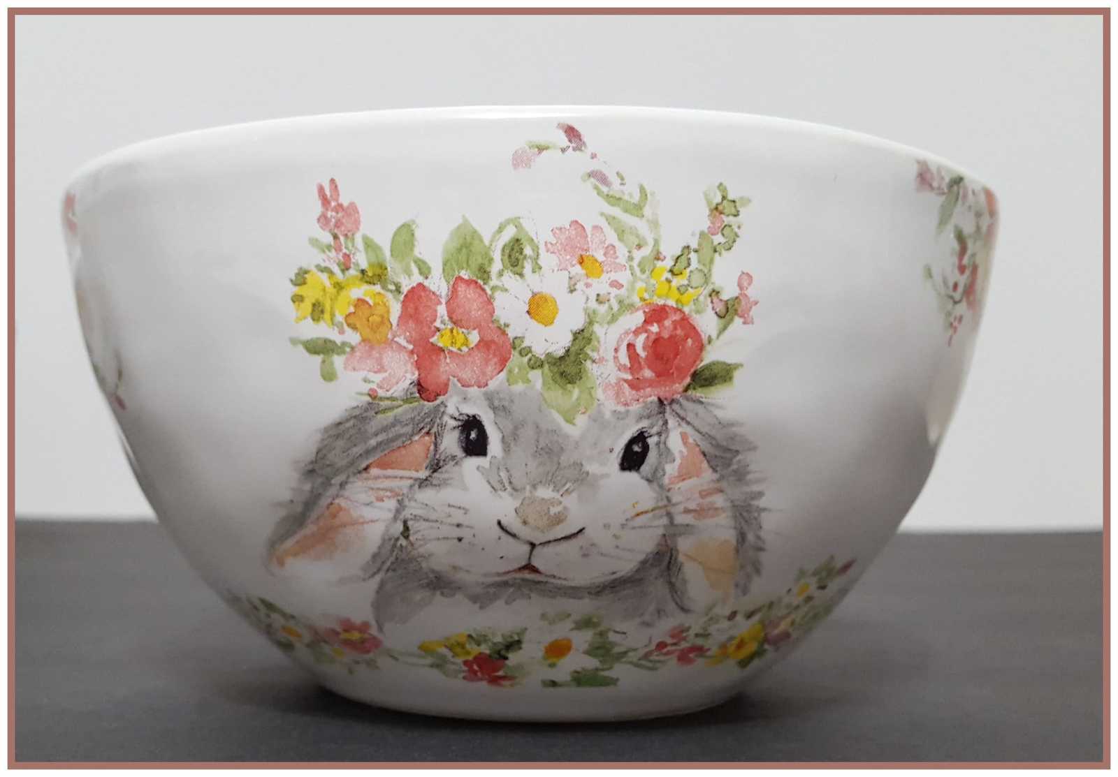 Attractive bowls showcase floral imagery with watercolor style bunny faces in 2 styles to add seasonal flair to your Easter table