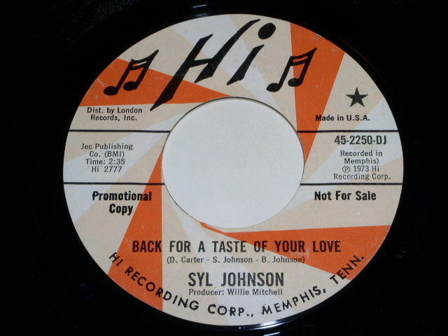 This is a vintage promotional 45 rpm release of the song, "Back For A Taste Of Your Love" by Syl Johnson. Flipside: "Wind, Blow Her Back My Way". Record label: Hi 45-2250 DJ.
