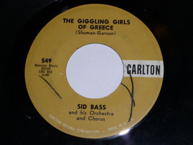 This is a vintage 45 rpm phonograph record by Sid Bass, entitled, "The Giggling Girls Of Greece". Flipside: "Funny Bone". Record label: Carlton 549.