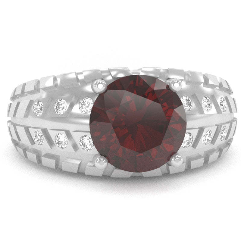 Show your free and adventurous spirit with a 14k solid white gold tire tread garnet and diamond ring. With a bold and powerful tire tread design with a big round birthstone set in the middle surrounded by 12 genuine diamonds spread evenly on both sides of the stone. A perfect gift for any car or motorcycle lover.