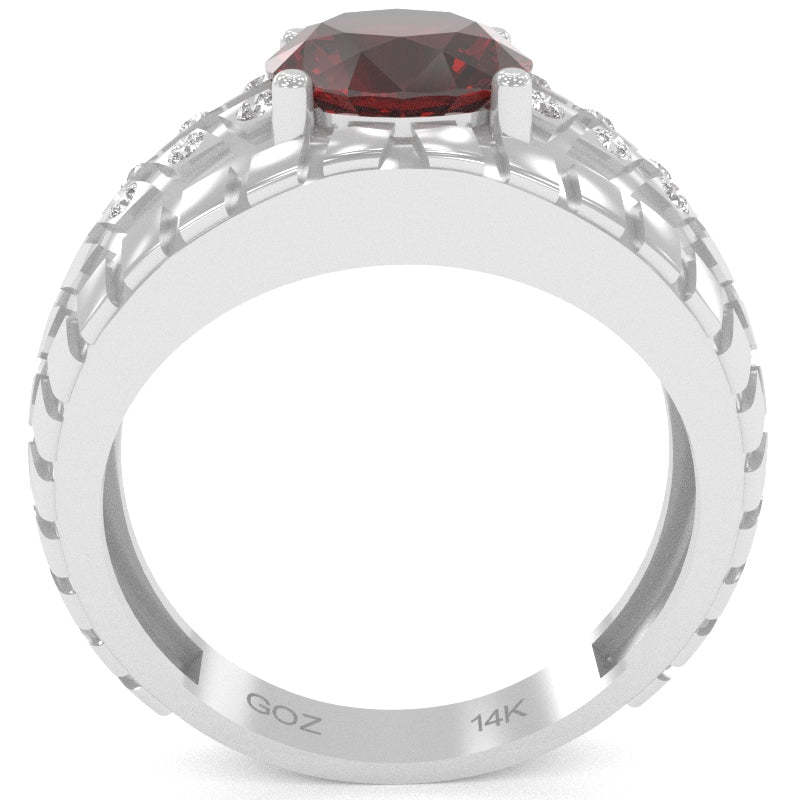 Show your free and adventurous spirit with a 14k solid white gold tire tread lab-created ruby and diamond ring. With a bold and powerful tire tread design with a big round birthstone set in the middle surrounded by 12 genuine diamonds spread evenly on both sides of the stone. A perfect gift for any car or motorcycle lover.