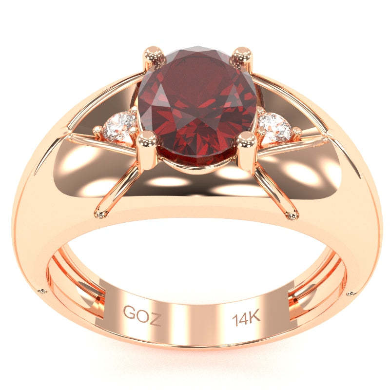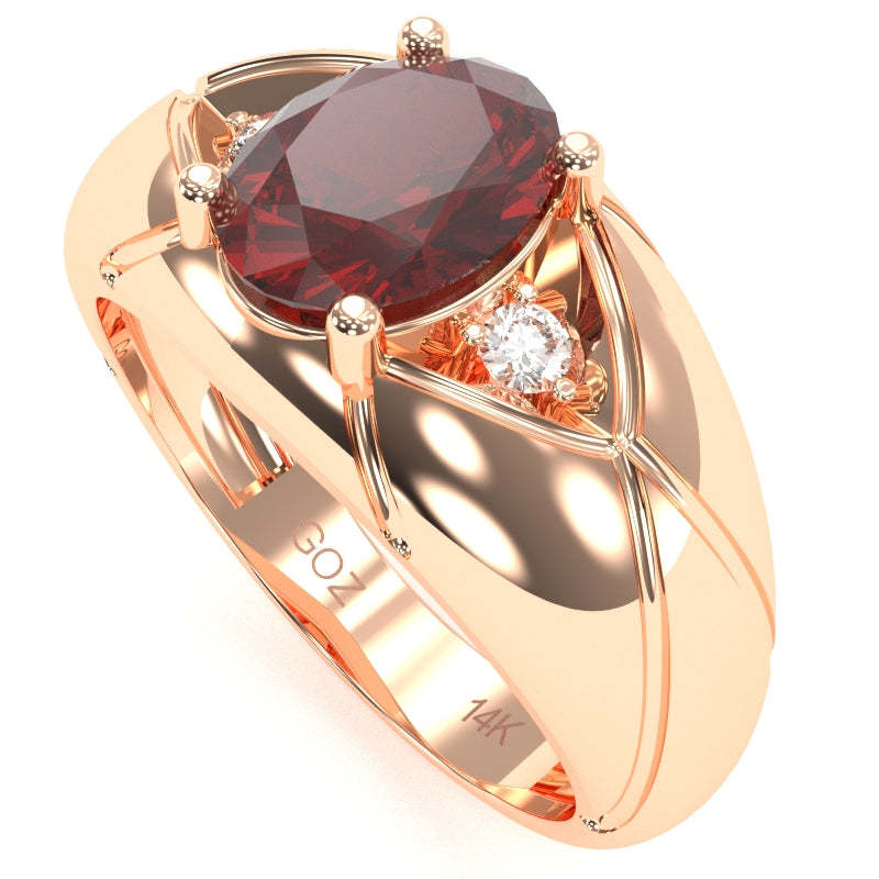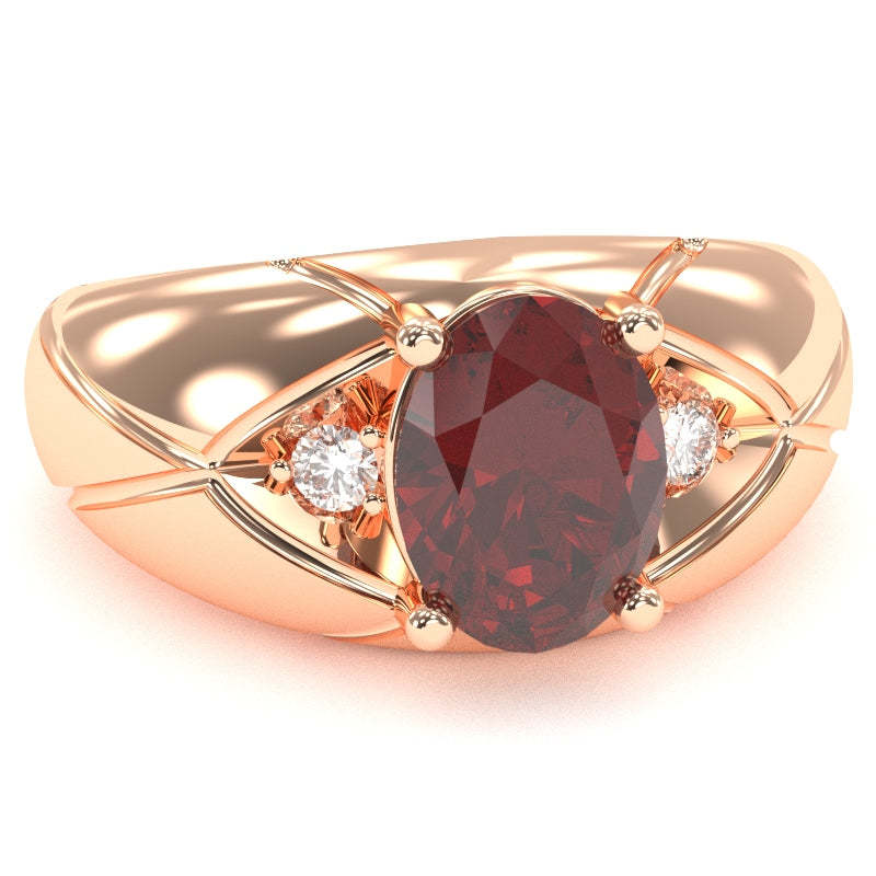 Treat yourself or your partner to a very cool, symmetrical shapes designer lab-created ruby and diamond ring. This men's ring is crafted in solid 14k rose gold with an oval center stone surrounded by 2 bright diamonds with distinct symmetrical groves on all sides of the ring. A matching women's ring is available exclusively at Gems Of Zodiac!