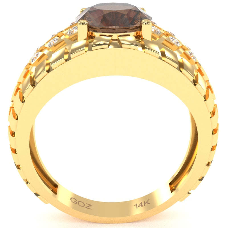 Men's Tire Tread Smoky Quartz Diamond Ring In Solid 14k Yellow Gold
