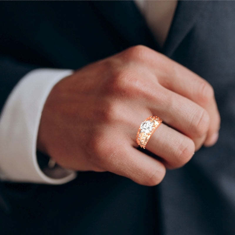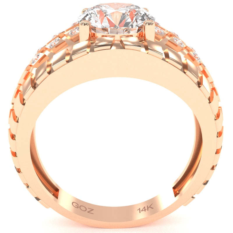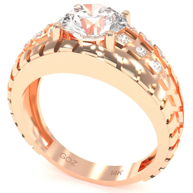 Men's Tire Tread White Topaz Diamond Ring In Solid 14k Rose Gold
