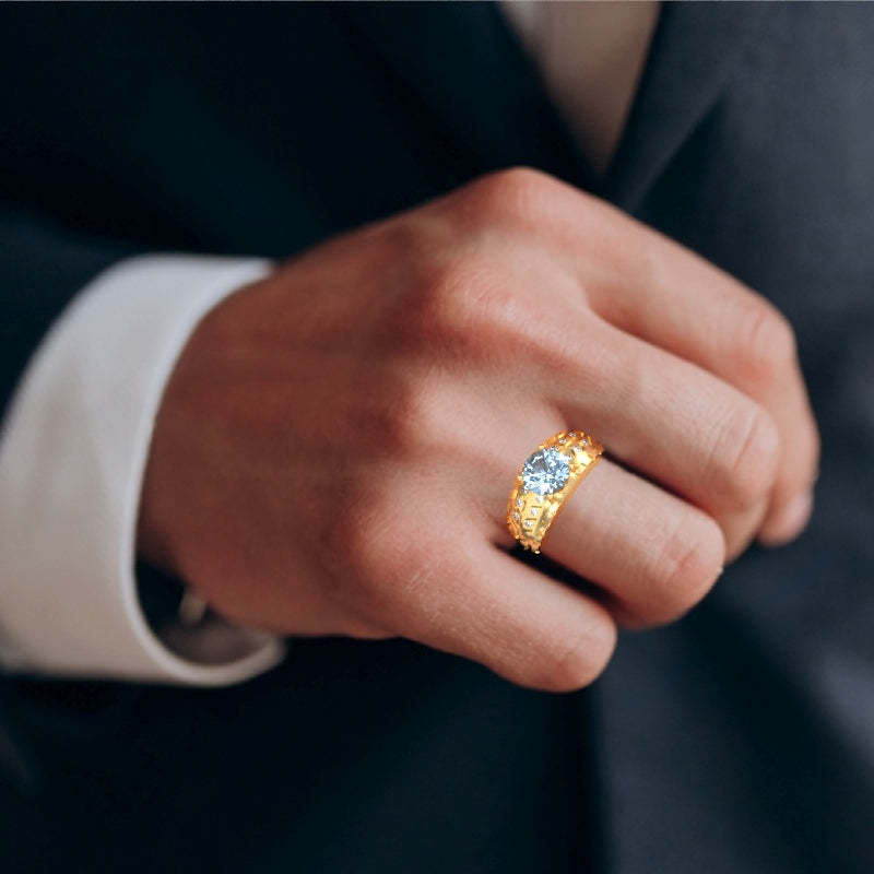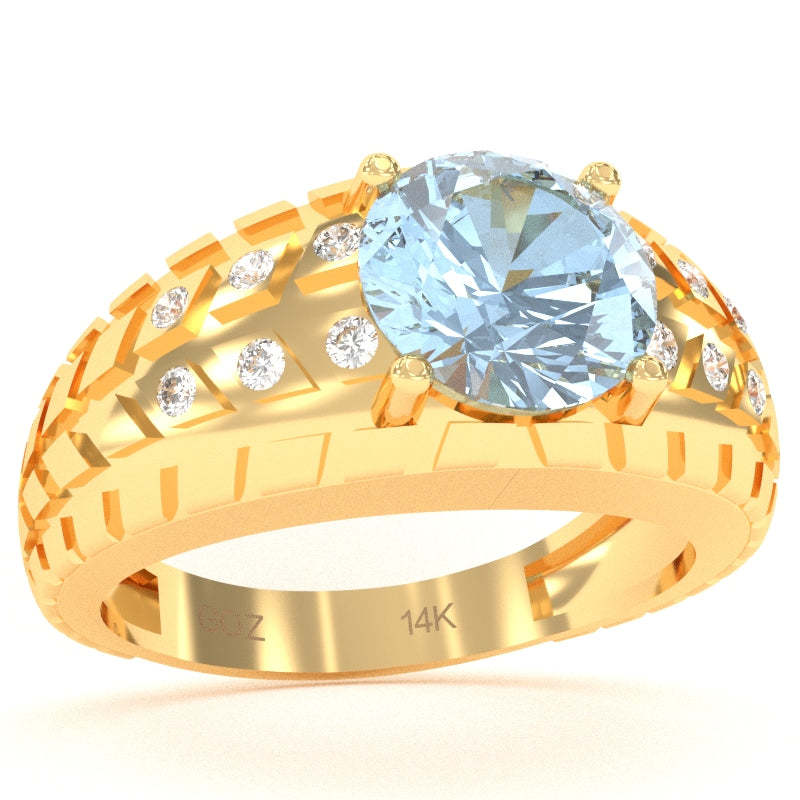 Men's Tire Tread Aquamarine Diamond Ring In Solid 14k Yellow Gold
