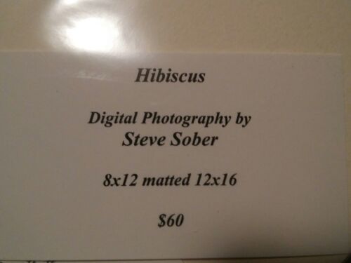 Here today is a nice photograph artwork signed by the artist Steve Sober. Nice Hibiscus flower. 8x12. Matted 12x16. Unframed. Original price of these is $60.00. See photos as they are an important part of the description and will help you know what you are bidding on. I do not accept returns. I do my best to describe all items but Sometimes I miss things so the photos are important. . Please Please ask questions. Thanks for bidding and good luck. Check out all my items for some great finds. Lots of cool stuff at my sales. I can combine shipping on most.
