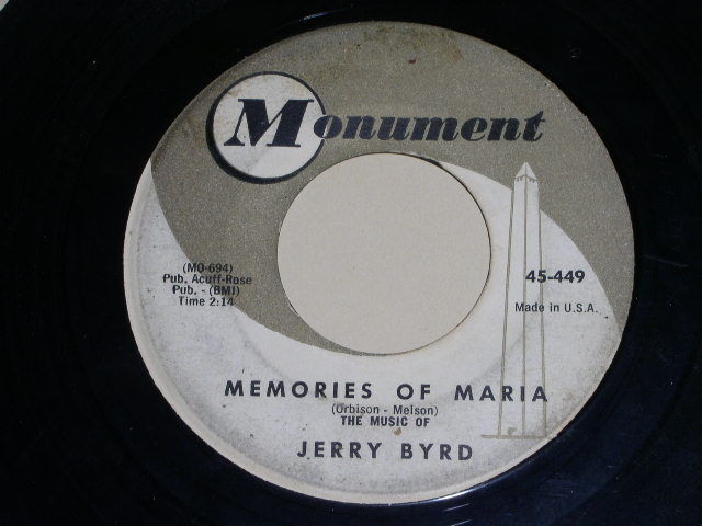 This is the original vintage 45 rpm release of the Jerry Byrd song, "Memories Of Maria". Flipside: "Invitation". Record label Monument 45-449. A terrific addition to that 45 rpm stack becoming re-popularized with the sale of those new phonographs being sold everywhere. There is no substitute for the “look” and “feel” of the old 45. This will surely bring back those memories.