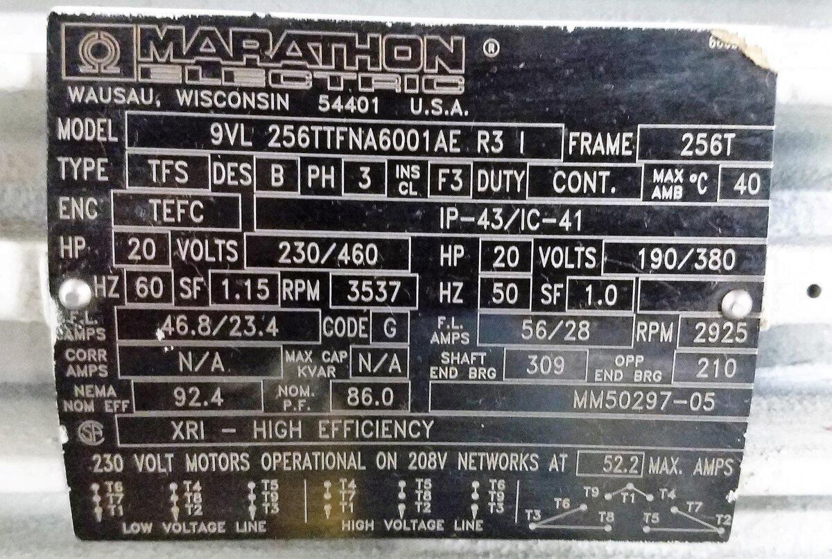 MARATHON ELECTRIC 20 HP, 230/460 VAC, 3537 RPM MOTOR, P/N: 9VL 256TTFNA6001AE R3