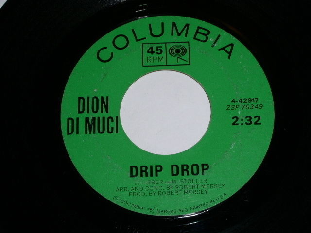 This is the original, vintage 45 rpm release of, "Drip Drop" by Dion Di Muci. Flipside: "No One's Waiting For Me". Record label Columbia 4-42917.