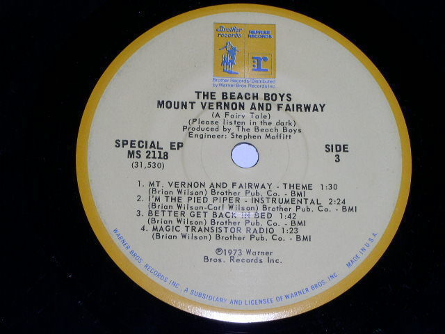 This is the original, vintage EP release of The Beach Boys', Mount Vernon And Fairway disc "Mt. Vernon And Fairway Theme/I'm The Pied Piper (instrumental)/Better Get Back In Bed/Magic Transistor Radio". Flipside: "I'm The Pied Piper/Radio King Dom". Record label .