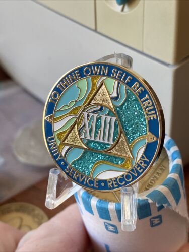 This 43 Year AA Medallion is a beautiful reminder of sobriety and recovery. The Caribbean Aqua Glitter adds a touch of sparkle to this special token. Perfect for those celebrating a milestone in their sober journey or as a gift for a loved one in recovery. This medallion is a great addition to any collection of recovery program tokens.