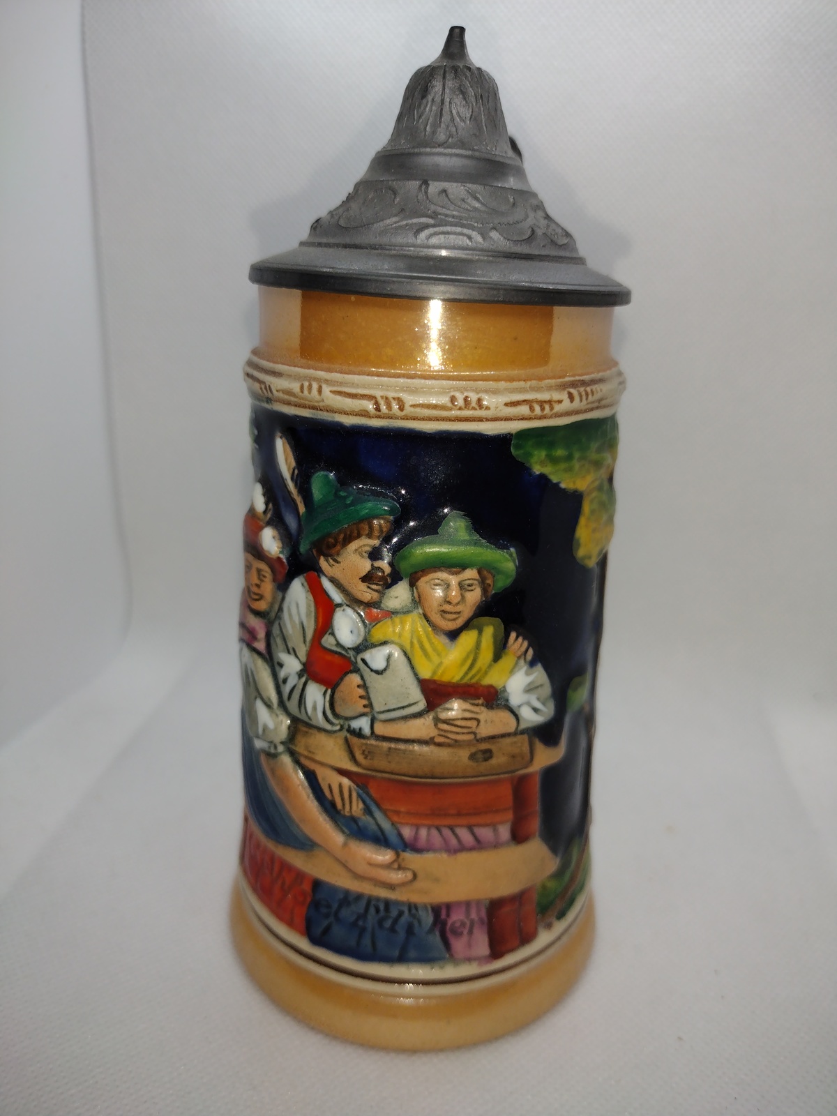 Very nice 9 inch tall lidded stein depicting a Biergarten scene. I believe this is from the early 1950s from when my Dad served in the US Army in West Germany back in 1953. This is free from blemishes, scratches, chips, etc but the pewter lid needs to be polished up to its original luster. This has been on display in a non-smoking household. All correspondence regarding this piece will be conducted through the Bonanza app only for both our security.