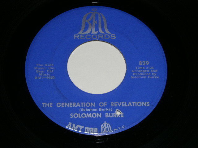 This is a vintage 45 rpm release of the song, "The Generation Of Revelations" by Solomon Burke. Flipside: "I'm Gonna Stay Right Here". Record label: Bell 829.