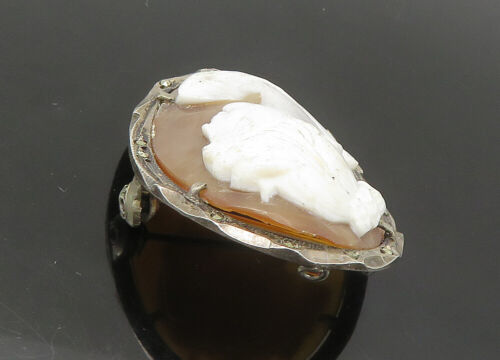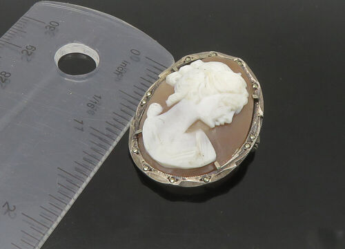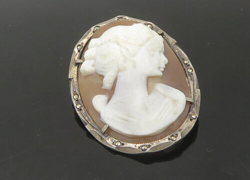 925 Sterling Silver - Vintage Antique Marcasite Border Cameo Brooch Pin - BP8760
