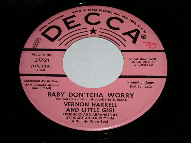This is a vintage Vernon Harrell And Little Gigi Promotional 45 rpm phonograph record release entitled, "Baby Don'tcha Worry". Flipside: "All That's Good". Record label Decca 31721.