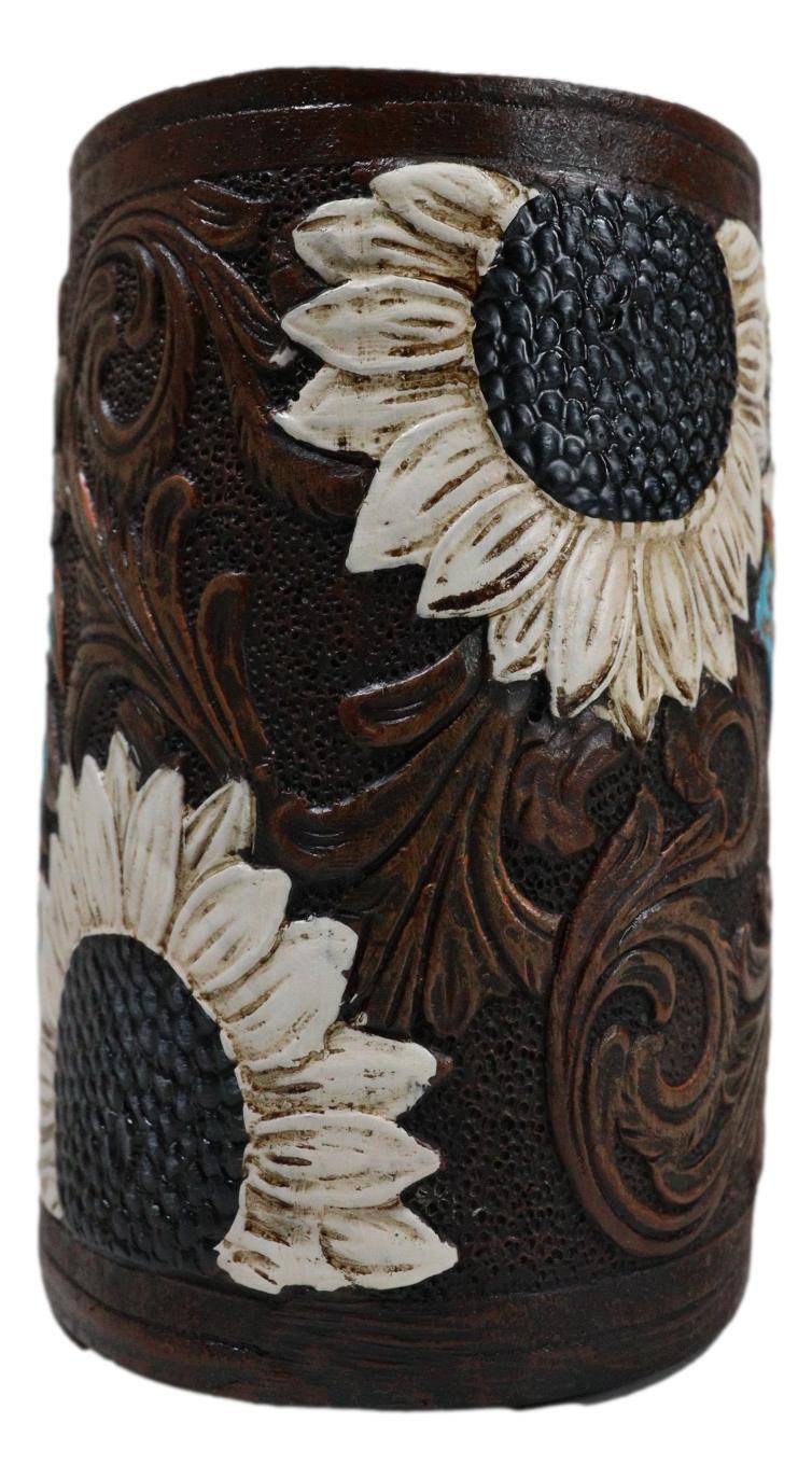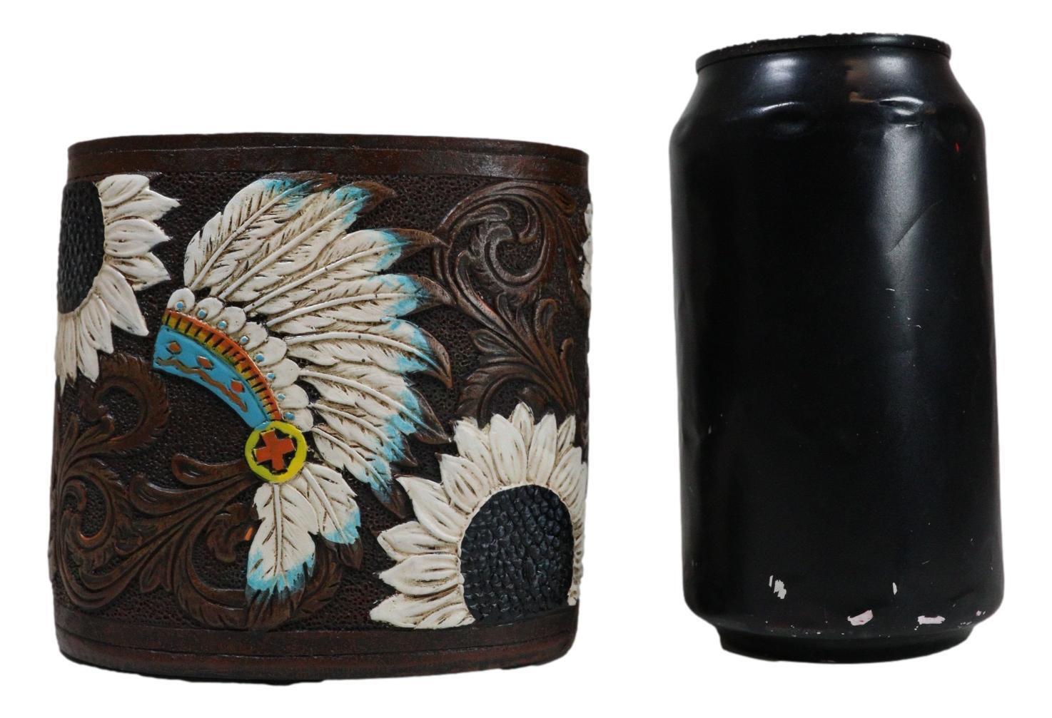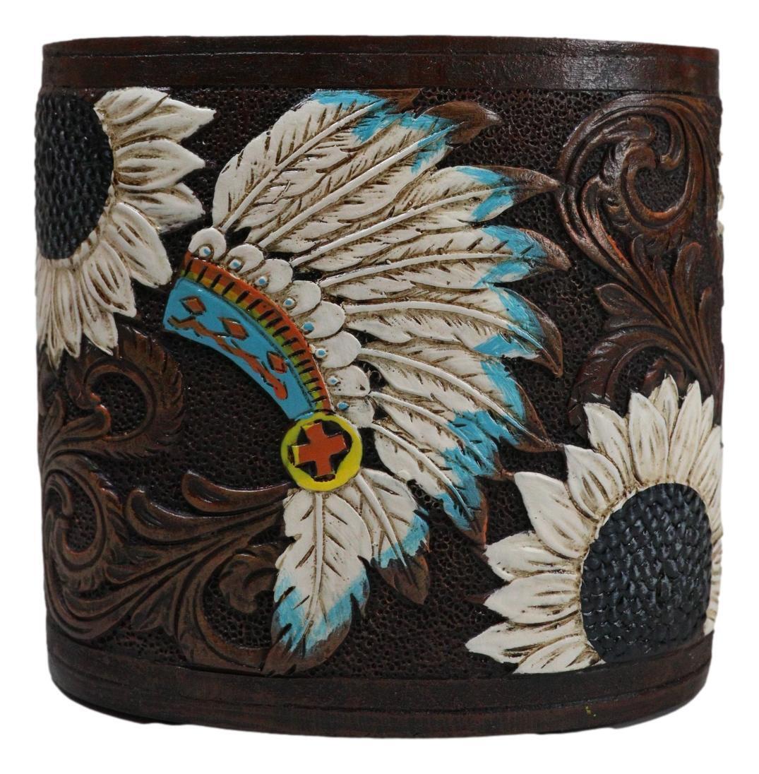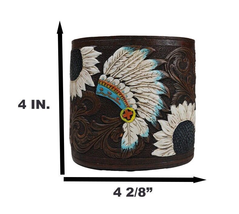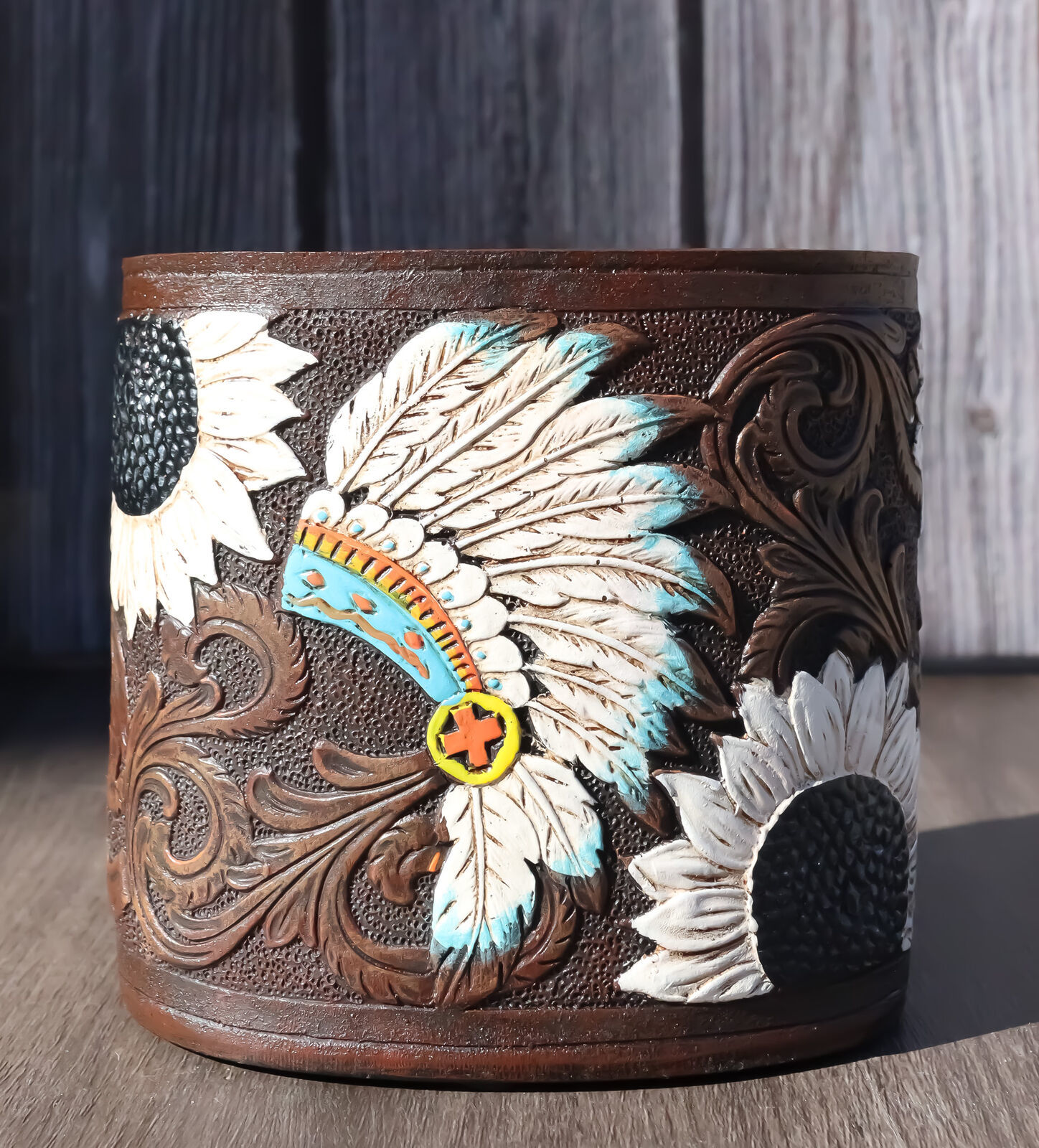 ? Introducing our exquisite Native Indian Chief Headdress in Faux Tooled Leather Scrollwork Toothbrush and Toothpaste Holder, a perfect blend of artistry and functionality for your bathroom. Crafted with an intricate faux tooled leather scrollwork design surrounding a Native Indian Chief headdress, this is not just a toothbrush/toothpaste holder; it's a symbol of heritage and a work of art that elevates your space.