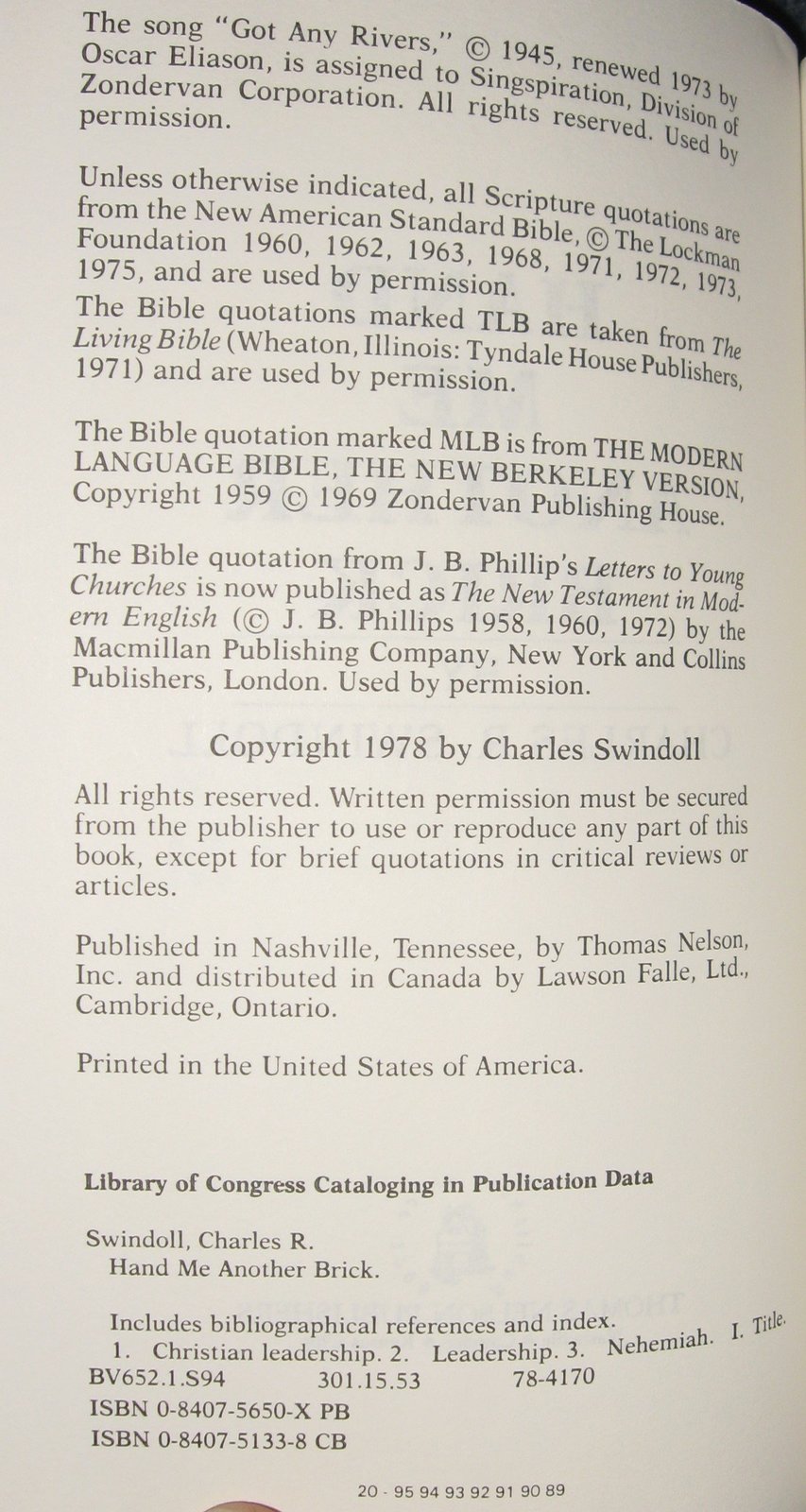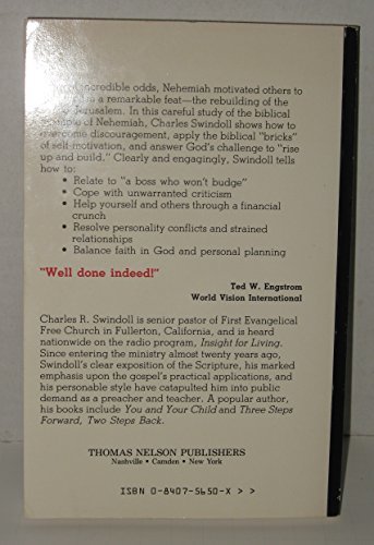 Product description: Do others look to you for leadership? Do you face a major task or shoulder heavy responsibilities? Do you want to take your leadership skills to a higher level?When Nehemiah confronted the task of rebuilding Jerusalem's wall, he was heartbroken by the damage he saw and nearly overwhelmed by the task that lay before him. Yet through the application of timeless leadership principles, Nehemiah completed this nearly impossible project, and laid a pattern for success which is just as valid for us today.Charles Swindoll brings his sensible and straightforward style to offer a deeply spiritual approach to the role of leader. Whatever the context, secular or ministerial, he demonstrates how to size up a task, organize and motivate a team, and respond to inevitable obstacles such as setbacksUnrelenting deadlinesCriticism and outside resistancePersonality conflictsFinancial pressures and temptationsThe insights that Swindoll draws from Nehemiah's wise administration will change your approach to leadership forever.