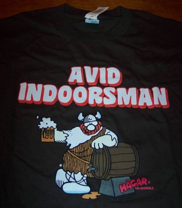 This is a HAGAR THE HORRIBLE "AVID INDOORSMAN" T-shirt. It is a size MEDIUM, and it is New with the tag. It is 20 inches from armpit to armpit and 29 inches in length. The Print is made to look vintage. Combine auctions to save on shipping. AD