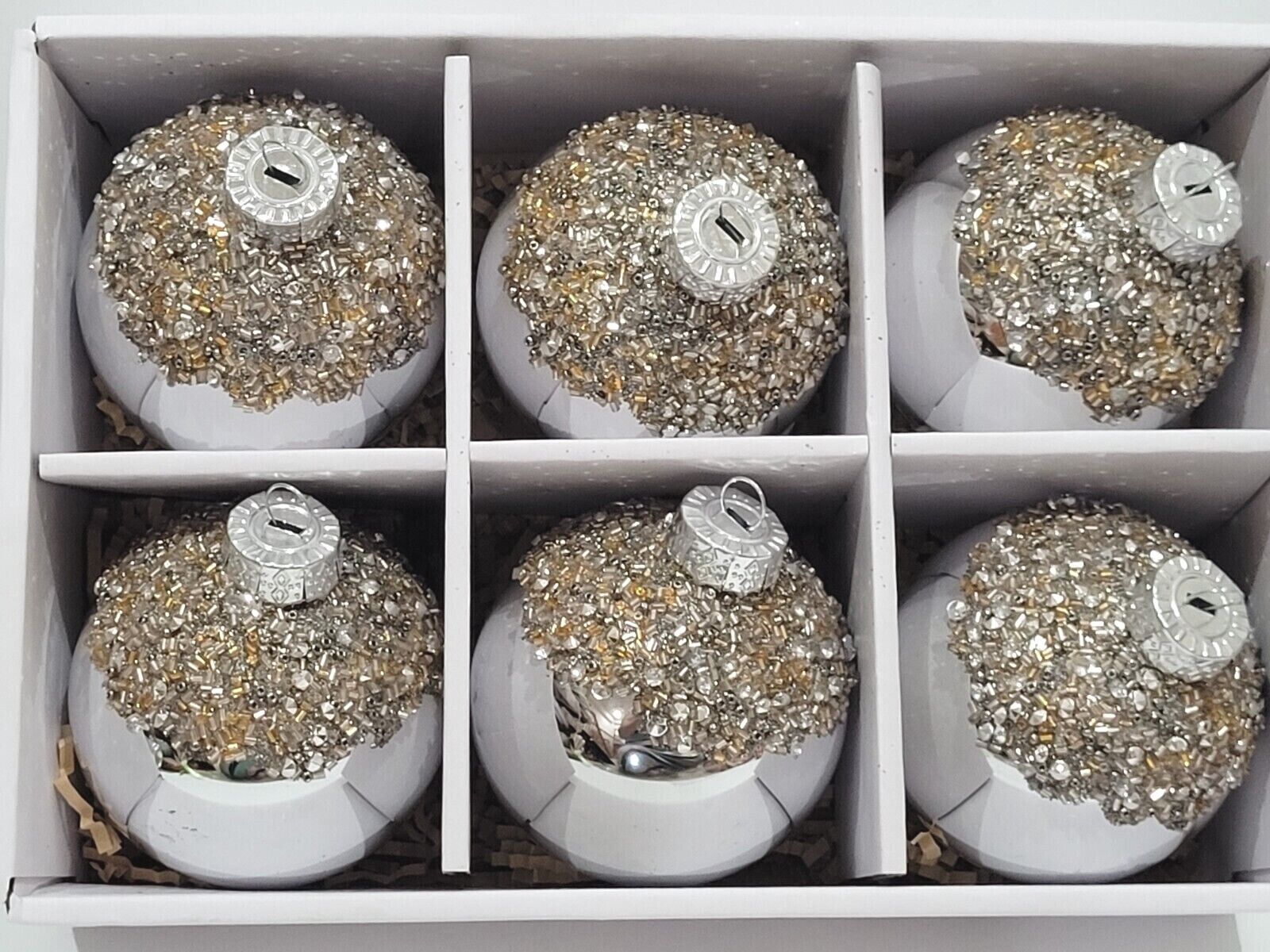 Christmas Glass Mirror Beaded Silver Gold Ornaments Home Decor 3.5" Set of 6