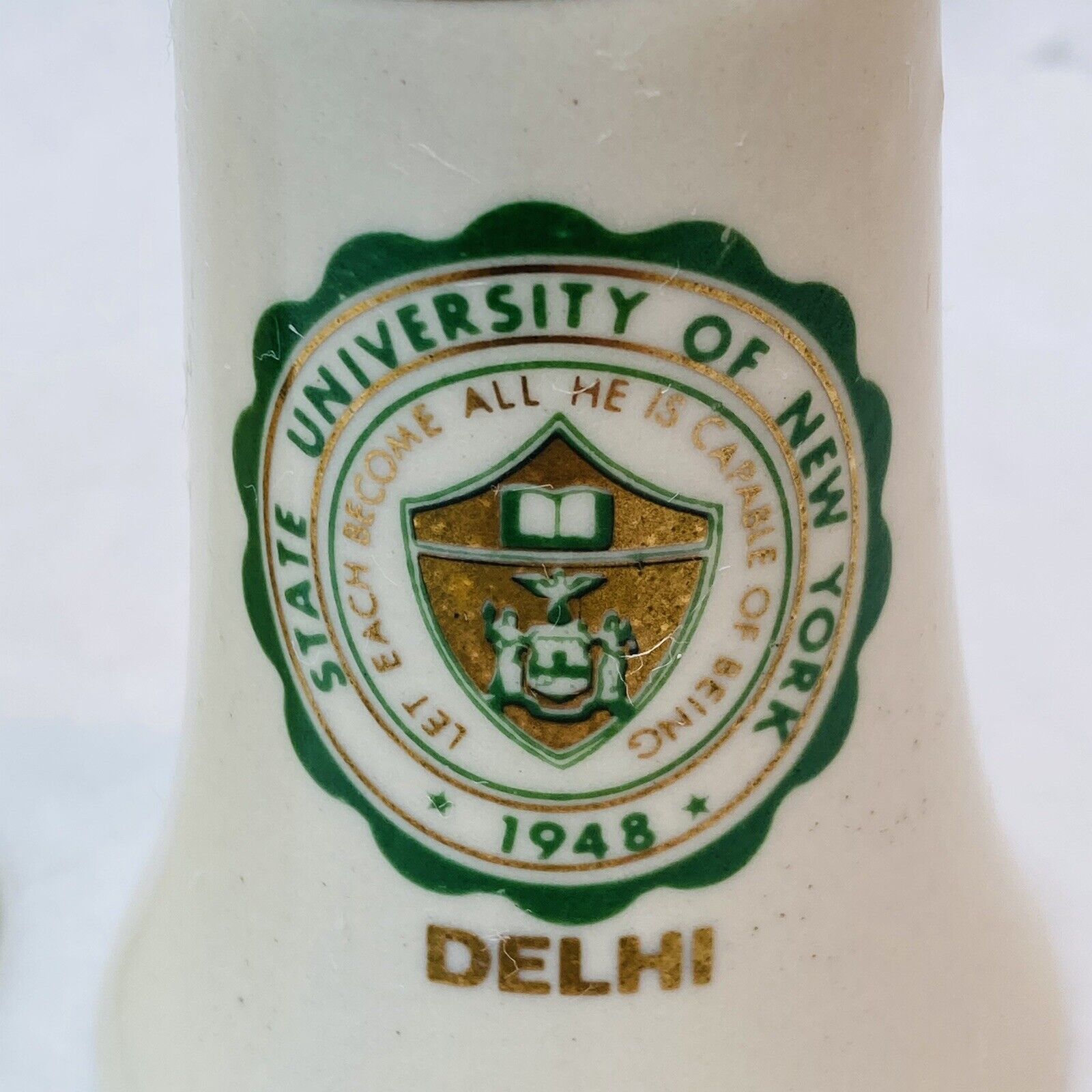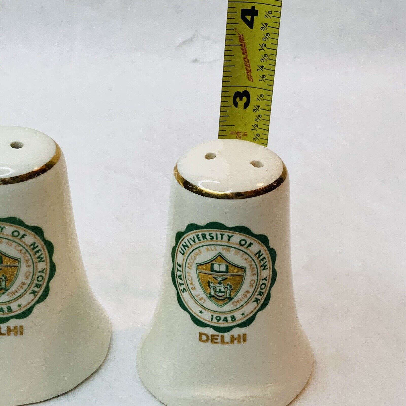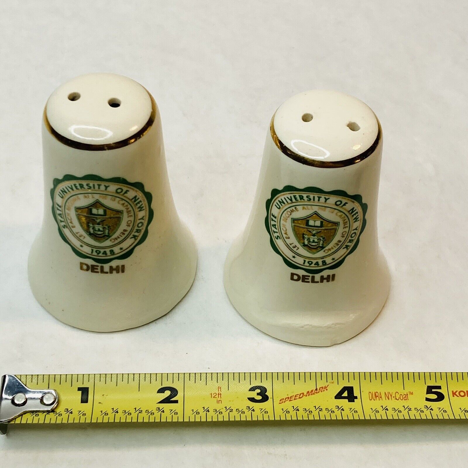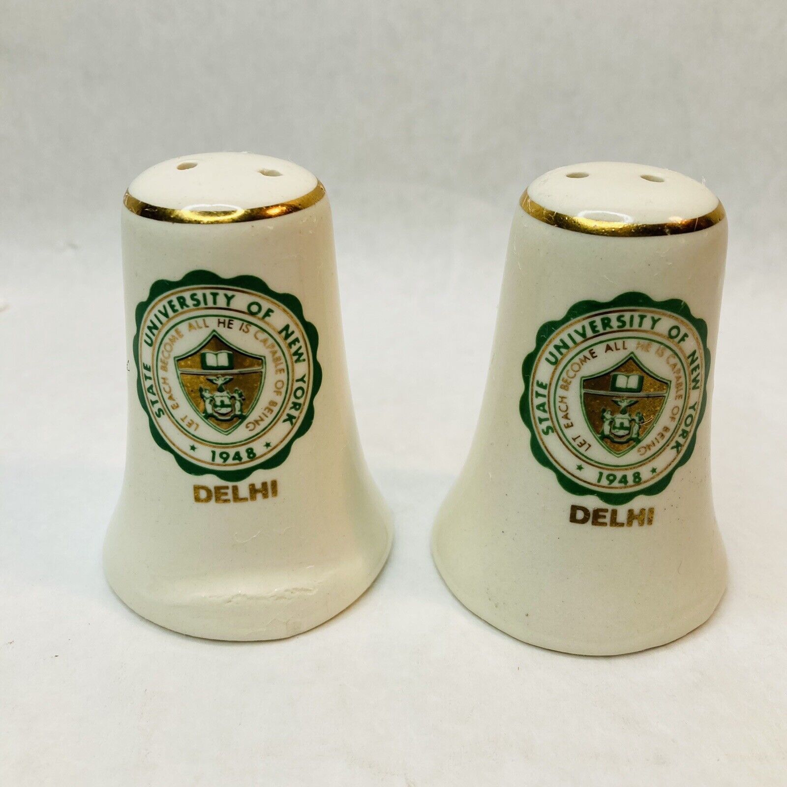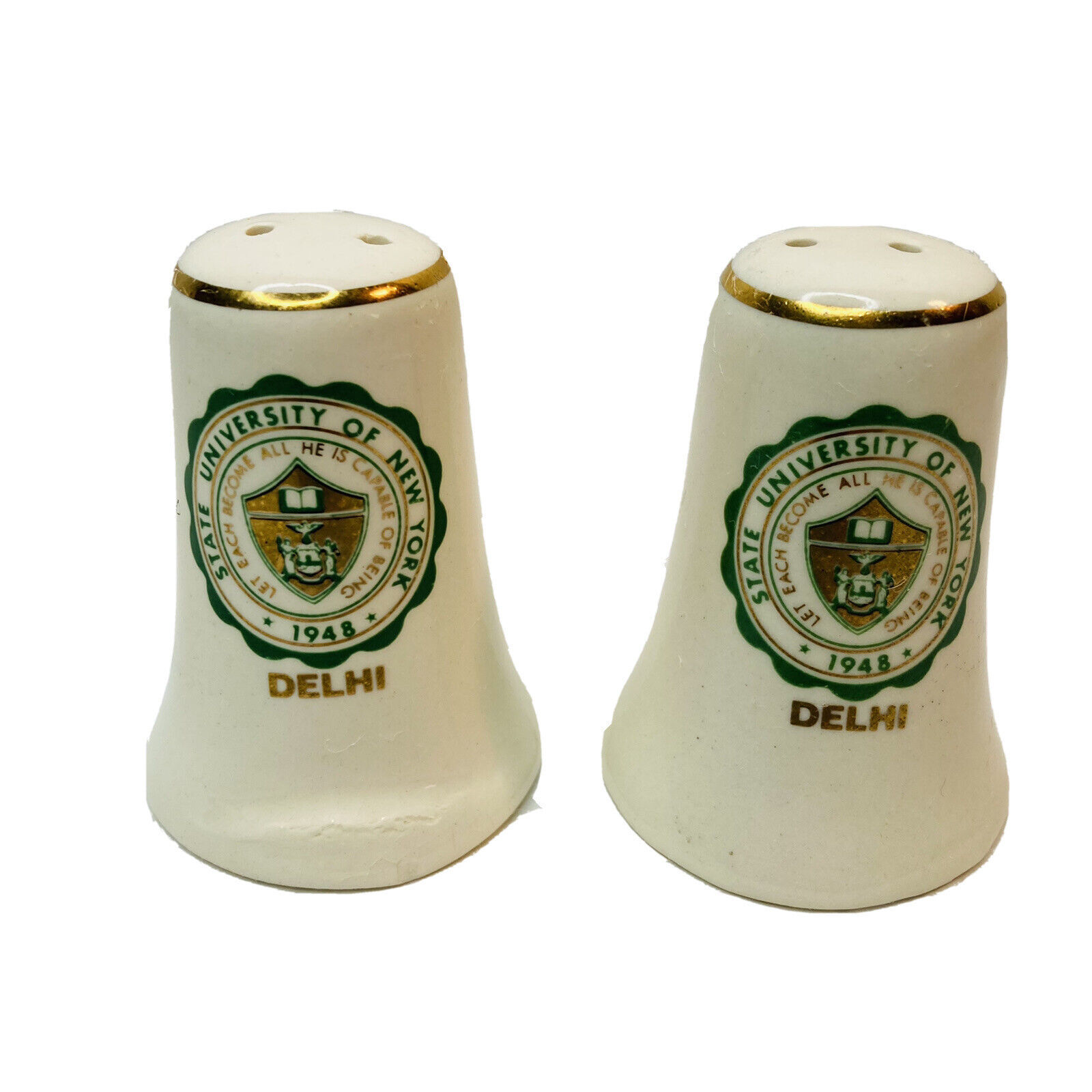 This is a great pair of USA made vintage ceramic salt and pepper shakers bearing the emblem of Delhi University in Delhi, New York. The motto reads ? Let each become all he is capable of being.? They are white ceramic and the ceramic is a bit crude and warbled- which adds to the charm- in my book! Each has a green and gold college emblem on each and a gold band around the top. Both shakers have 2 holes. Stamped Made In USA on base. Wonderful collectible memorabilia!