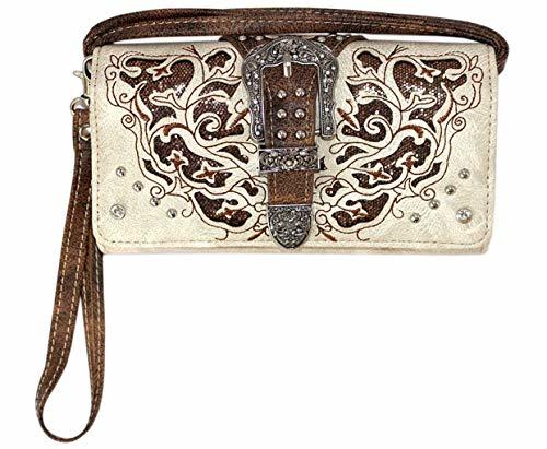 Texas West Western Rhinestone Laser Cut Buckle Crossbody Small Pouch Wallet in 5 colors. Wallet with a single, removable strap to convert the trifold wallet into a wristlet and a single, long removable shoulder/crossbody strap. Flat currency compartments, expanding accordion area; a zippered pocket on the inside for coins; 9 slots on the inside for cards, and 3 clear ID windows. Approx. Dimension: 7.5"L x 4.5"H x 2" W. Durably well made.
