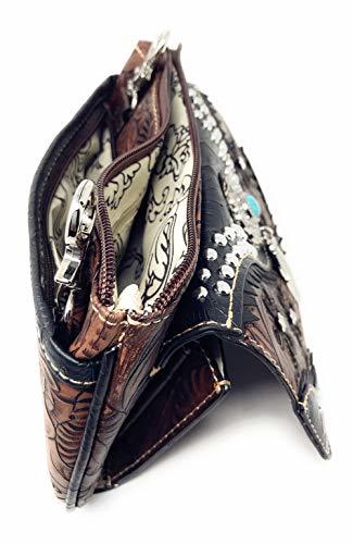 Texas West Western Rhinestone Concho Floral Laser Cut Crossbody Small Pouch Wallet PERFECT FOR EVERYDAY: Measures: 7.5" x 4.5" x2" Wallet with a single, removable strap to convert the trifold wallet into a wristlet and a single, long removable shoulder/crossbody strap. Flat currency compartments, expanding accordion area; a zippered pocket on the inside for coins; 9 slots on the inside for cards, and 3 clear ID windows. Trifold closure, iPhone/smartphone pockets included with clear I.D slot. durable well made.