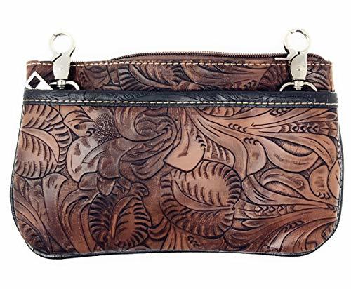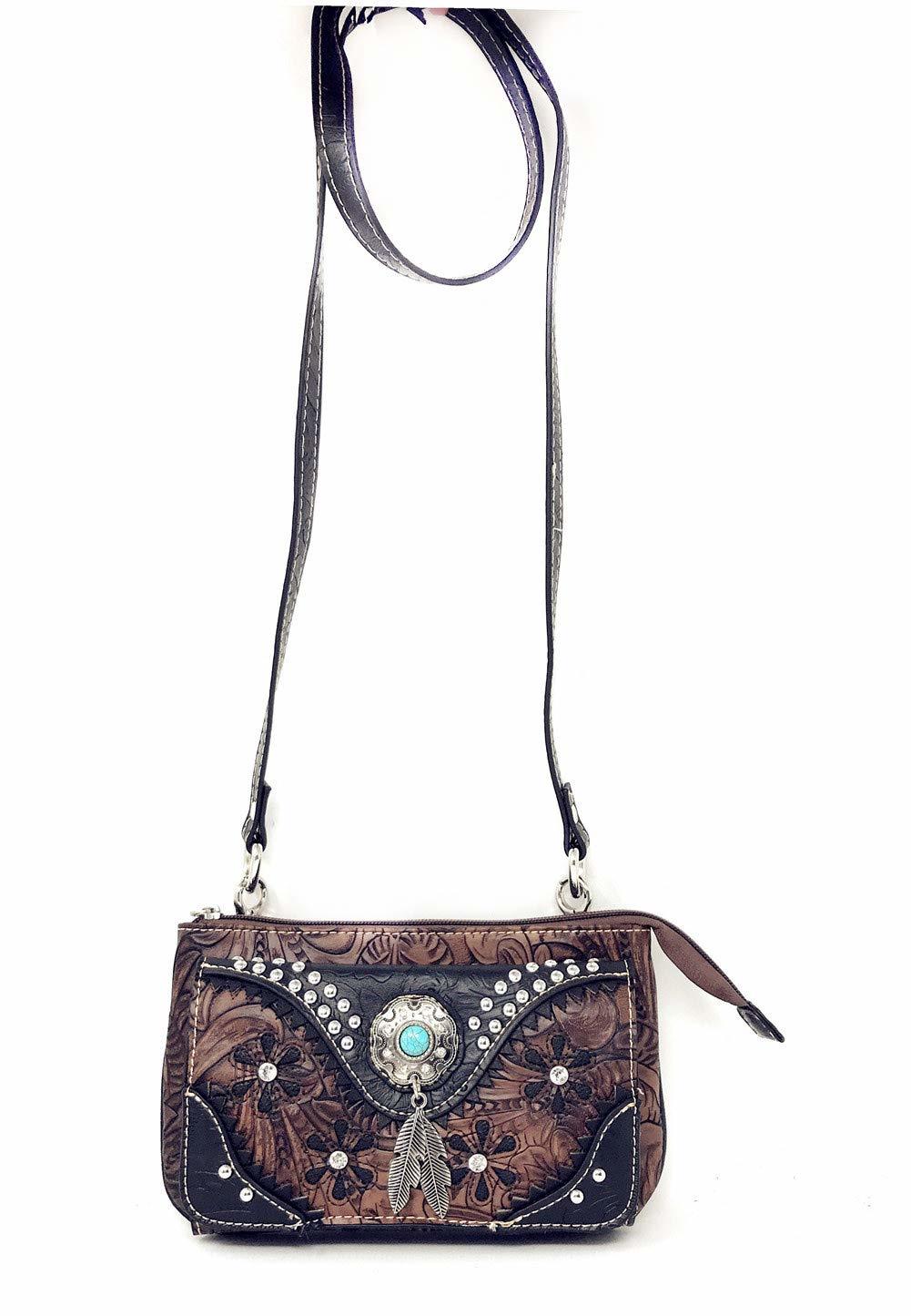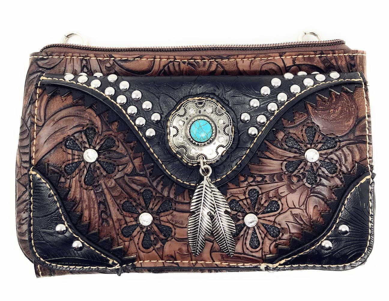 Product description: Texas West Western Rhinestone Concho Floral Laser-Cut Crossbody Small Pouch Wallet: Measures: 7.5" x 4.5" x2" Wallet with a single, removable strap to convert the trifold wallet into a wristlet and a single, long removable shoulder/crossbody strap. Flat currency compartments, expanding accordion area; a zippered pocket inside for coins; 9 slots inside for cards, and 3 clear ID windows. Trifold closure, Phones/smartphone pockets included with clear I.D slot. Durably well made.