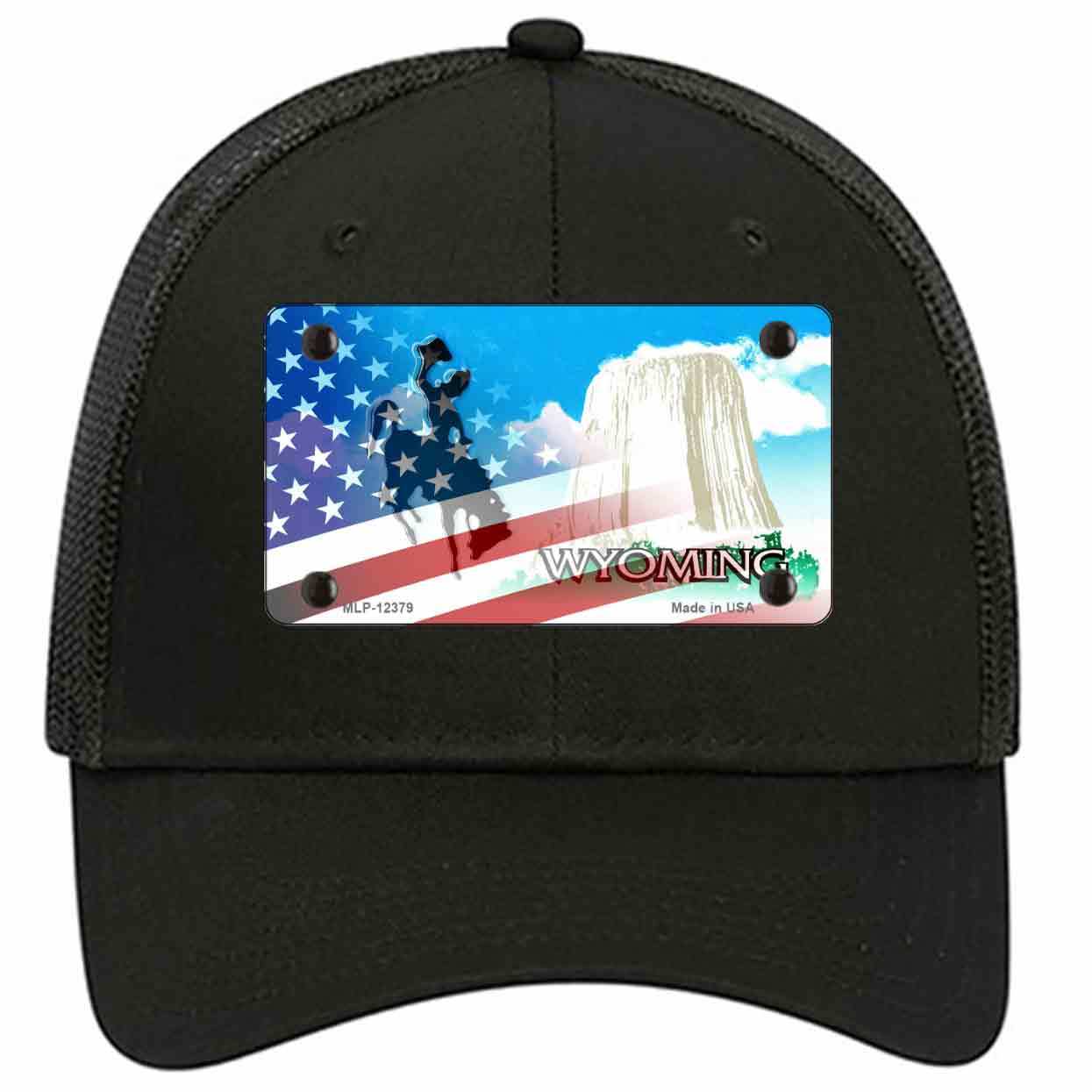 Wyoming with American Flag Novelty Black Mesh License Plate Hat