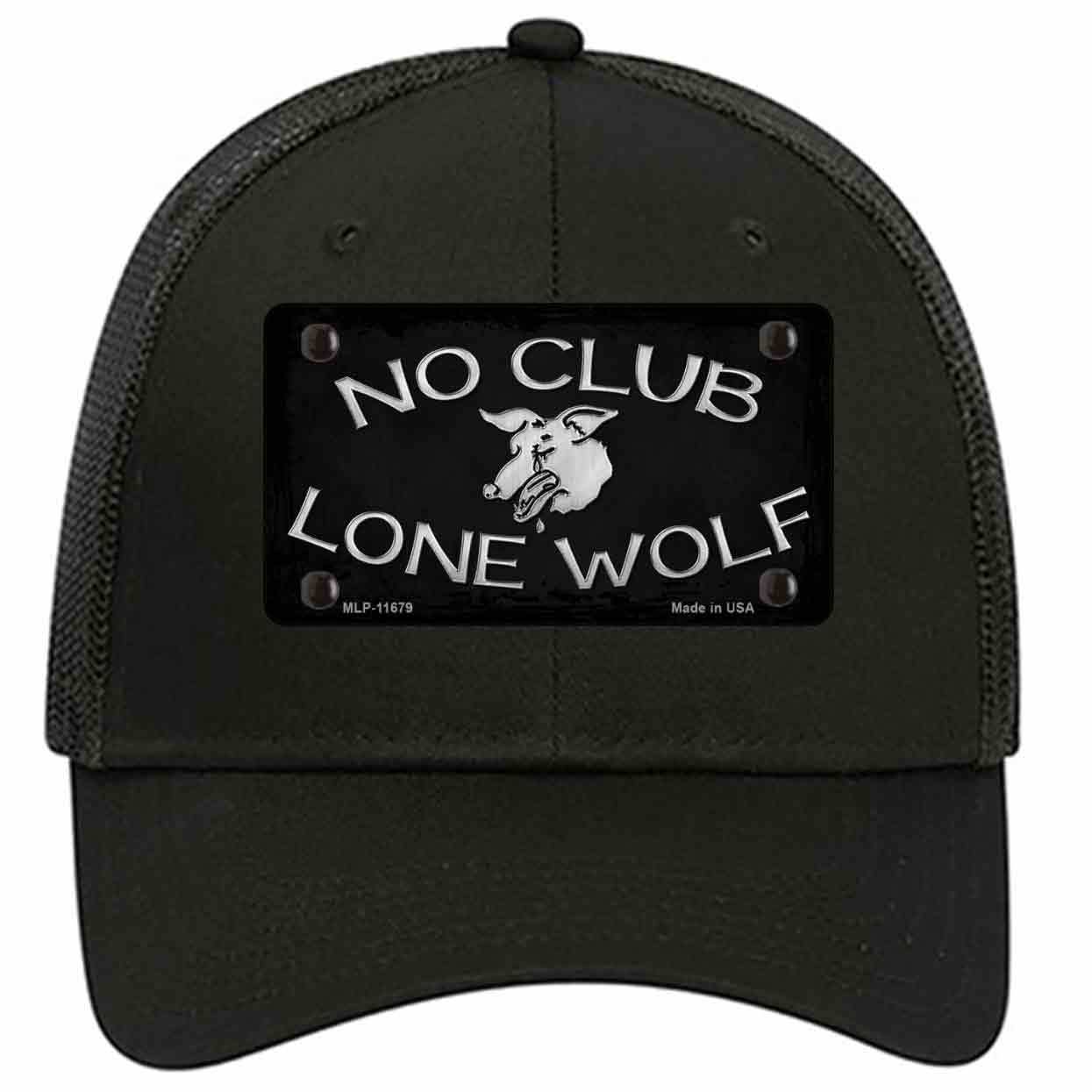 No Club Lone Wolf Novelty License Plate Hat. Show off your style with our mounted 4" x 2.2" metal patches on our 6 Panel SnapBack or Velcro Closer Hats. Choose between our different color and style caps. Our metal patches are made out of .025 grade aluminum and the designs are dye sublimated onto the metal to give a quality high gloss finish. Our metal patches are firmly attached using double cap rivets to give the patch an elegant tight fitting look!