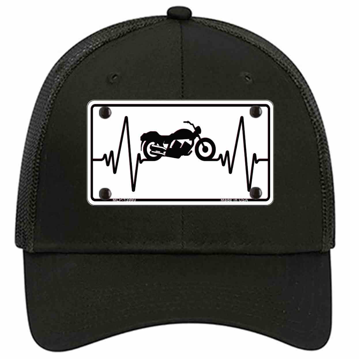 Motorcycle Heart Beat Novelty License Plate Hat Tag. Show off your style with our mounted 4" x 2.2" metal patches on our 6 Panel SnapBack or Velcro Closer Hats. Choose between our different color and style caps. Our metal patches are made out of .025 grade aluminum and the designs are dye sublimated onto the metal to give a quality high gloss finish. Our metal patches are firmly attached using double cap rivets to give the patch an elegant tight fitting look!