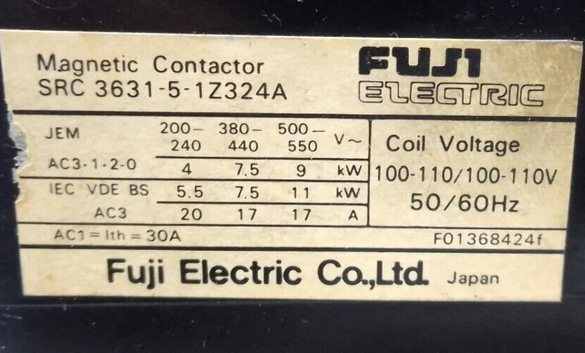 The Fuji SRC 3631-5-1Z324A is a 30 amp magnetic contactor designed for 220 volt AC power. It's manufactured by