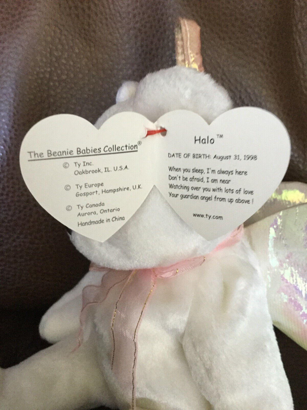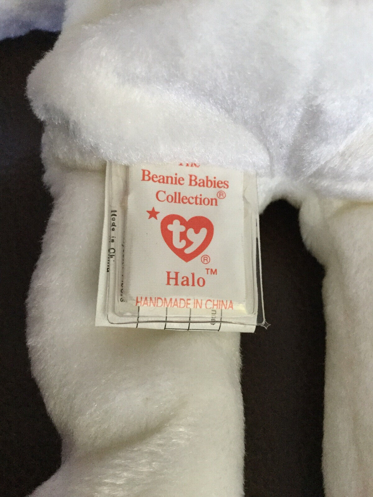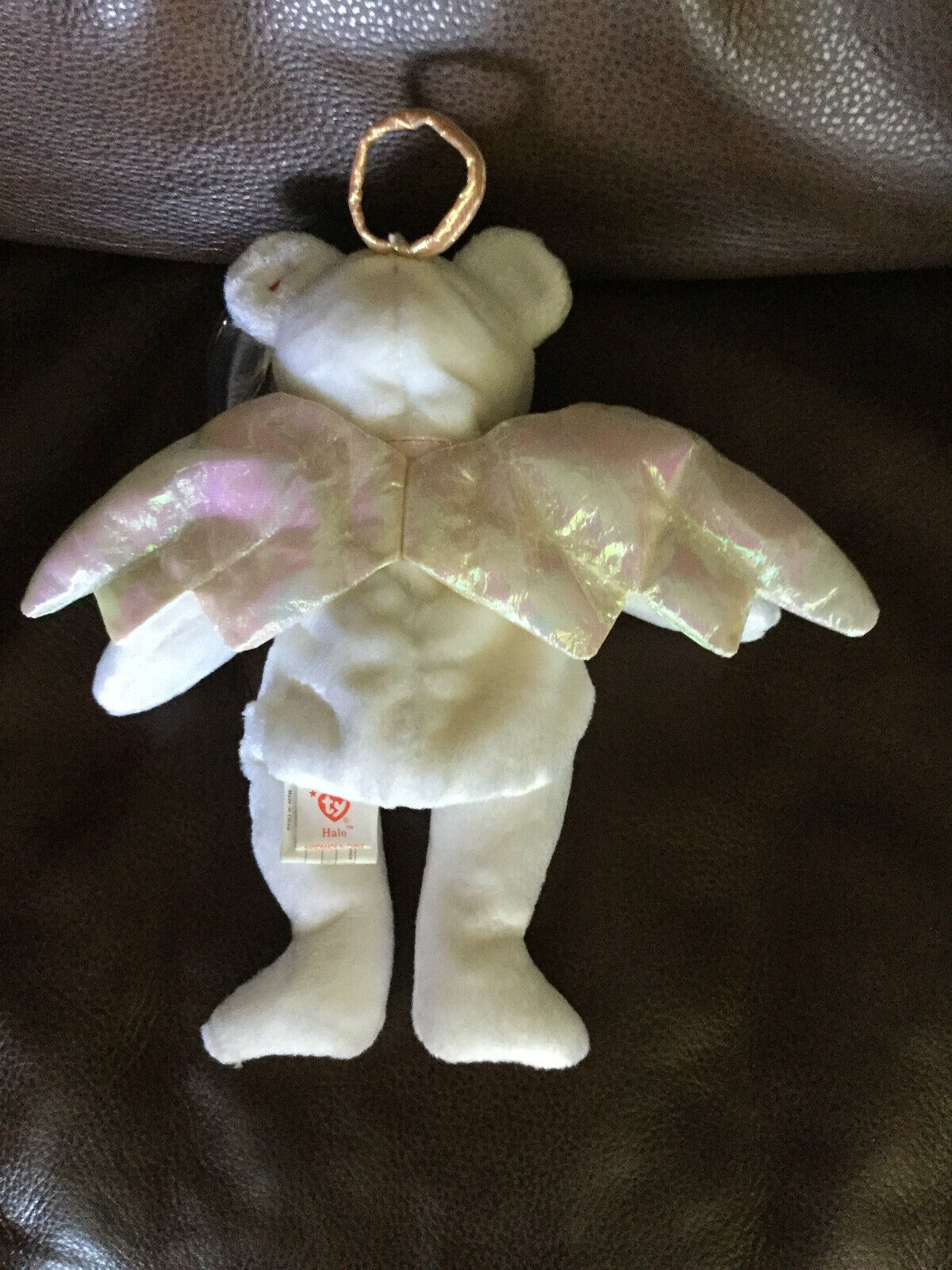 Today " Halo the Bear, with its angelic white fur and golden halo, is a heavenly addition to the Beanie Baby lineup. Its limited production and divine appearance have propelled its value to astronomical heights."