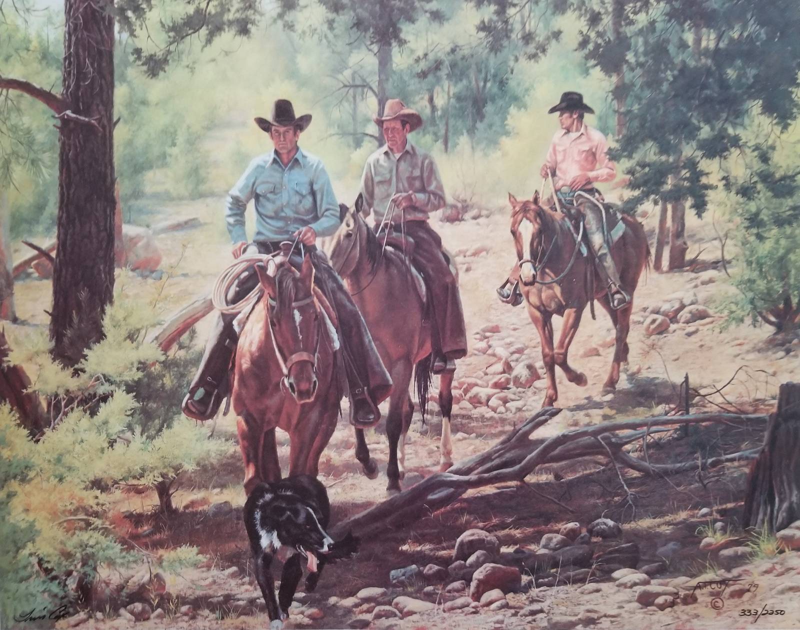 Making the Circle is a signed and numbered limited edition print by Tim Cox. It depicts three cowboys riding back to the ranch. They have their border collie leading the way.