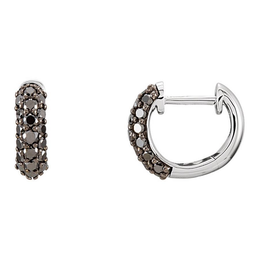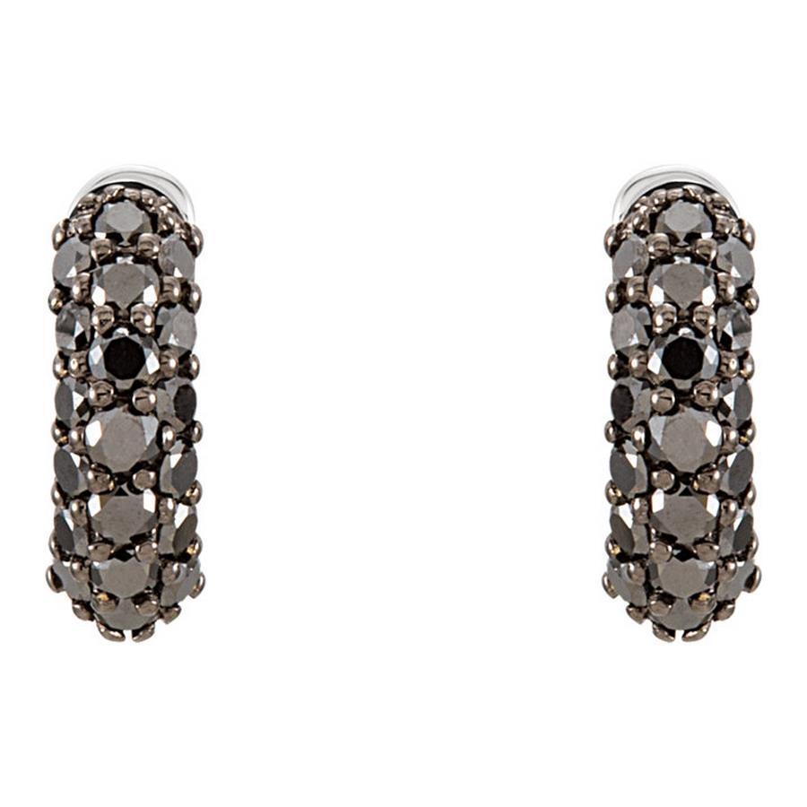 This pair of hoop earrings feature 38, round pave set black diamonds in 14k white gold.