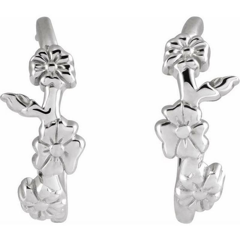 This pair of platinum hoop earrings feature a pretty delicate floral design. The hoop earrings are secured with pushbacks.