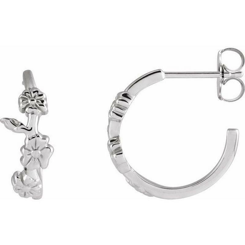 This pair of rhodium-plated, 14k white gold hoop earrings feature a pretty delicate floral design. The hoop earrings are secured with pushbacks.