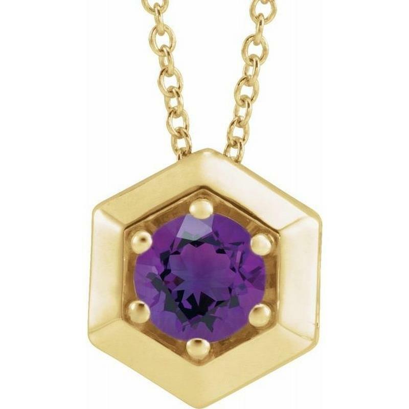 This 14k yellow gold geometric necklace features a round faceted natural amethyst gemstone. The pendant hangs on a 14k yellow gold 16 - 18 inch adjustable solid cable chain. Secures with a spring-ring.