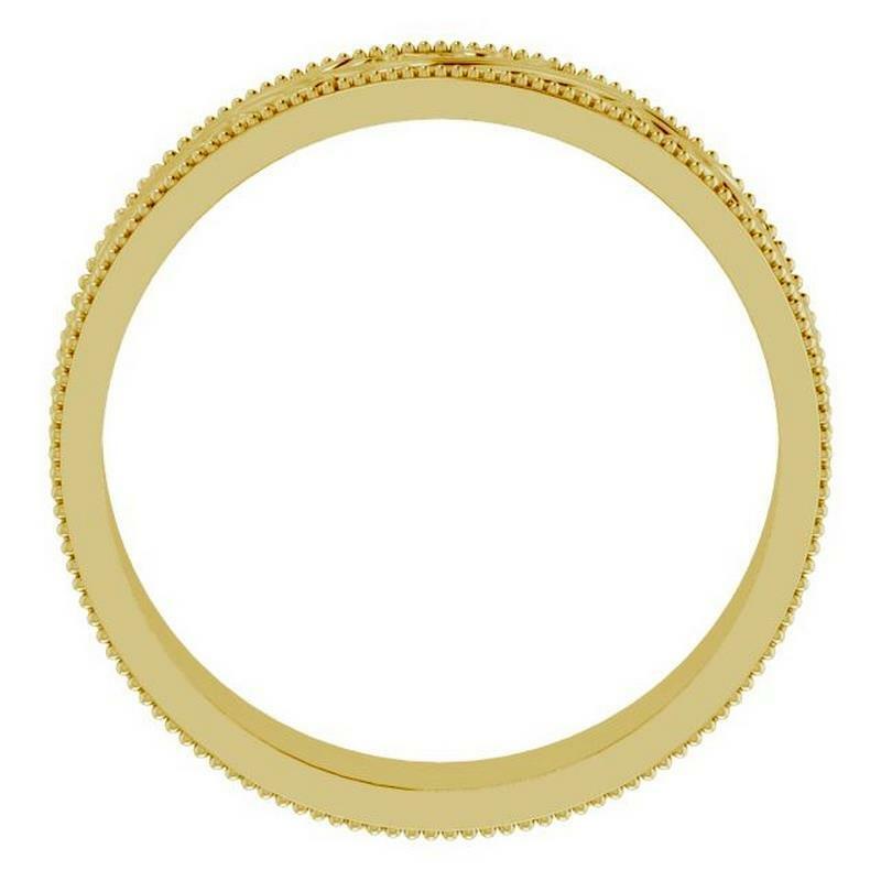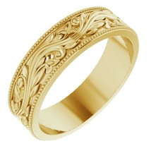This beautiful 6 mm wedding band is crafted in 14k yellow gold and features a sculptural design with milgrain edges.